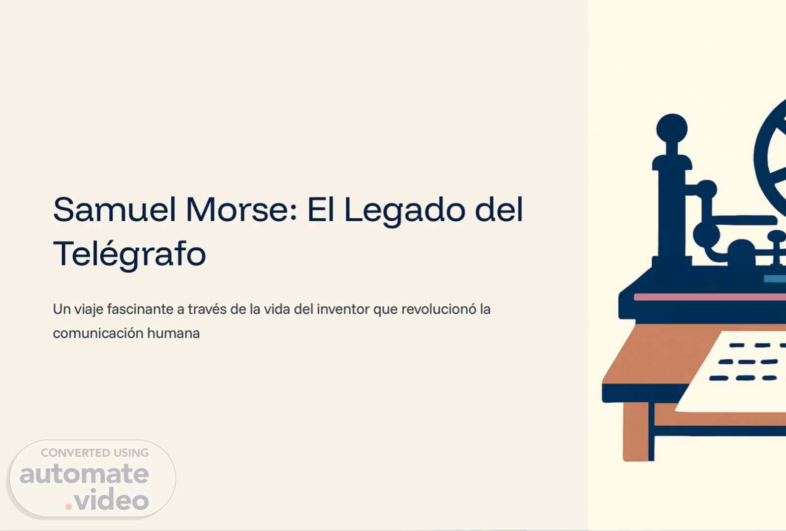 [Audio] "Samuel Morse fue un inventor y artista estadounidense, conocido por desarrollar el sistema de comunicación telegráfica. Fue un visionario que cambió la forma en que las personas se comunicaban. Su legado perdura hasta hoy en día." El invento del telégrafo permitió a los pioneros de la comunicación avanzar rápidamente. Los pioneros de la comunicación avanzaron rápidamente gracias al invento del telégrafo. El telégrafo revolucionó la forma en que las personas se comunicaban. La forma en que las personas se comunicaban se revolucionó gracias al telégrafo. El legado de Samuel Morse perdura hasta hoy en día. El legado de Samuel Morse sigue siendo relevante en la actualidad..