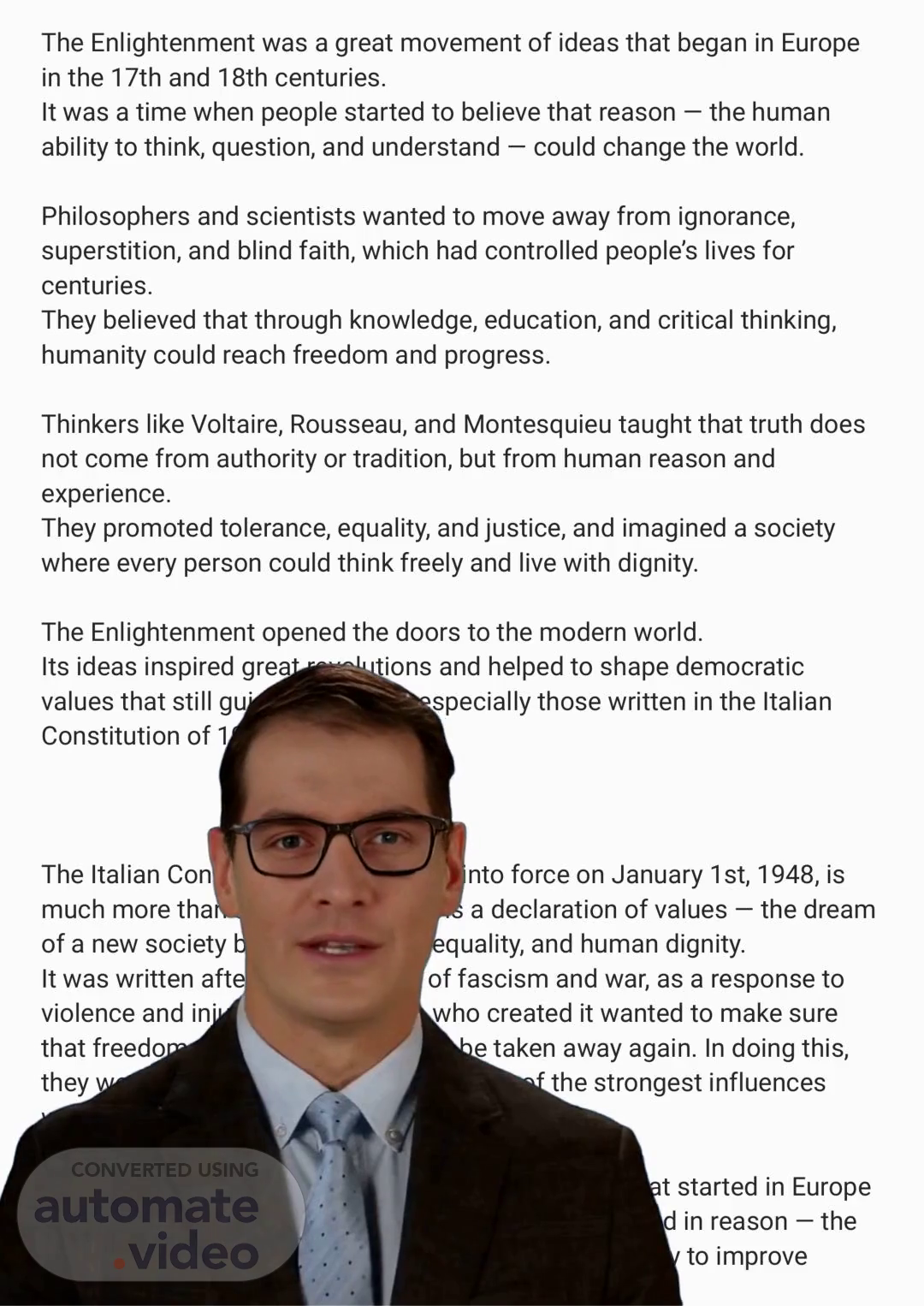 [Virtual Presenter] The Enlightenment was a major intellectual movement that took place in Europe during the 17th and 18th centuries. During this period, people began to believe that reason could have a significant impact on the world. Philosophers and scientists sought to move away from ignorance, superstition, and blind faith, which had dominated people's lives for centuries. They believed that through knowledge, education, and critical thinking, humans could achieve freedom and progress. Key thinkers such as Voltaire, Rousseau, and Montesquieu emphasized that truth does not come from authority or tradition, but rather from human reason and experience. They advocated for tolerance, equality, and justice, and envisioned a society where individuals could think freely and live with dignity. The Enlightenment laid the groundwork for the modern world. Its ideas inspired numerous revolutions and shaped democratic values that continue to influence our society today. The Italian Constitution, which went into effect on January 1st, 1948, reflects these ideals. This constitution is more than just a set of laws; it is a statement of values that envisions a society built on freedom, equality, and human dignity. Written in response to the atrocities of fascism and war, the constitution aimed to ensure that freedom and rights would never be taken away again. The creation of the constitution was influenced by various ideas, but one of the most significant was the Enlightenment..