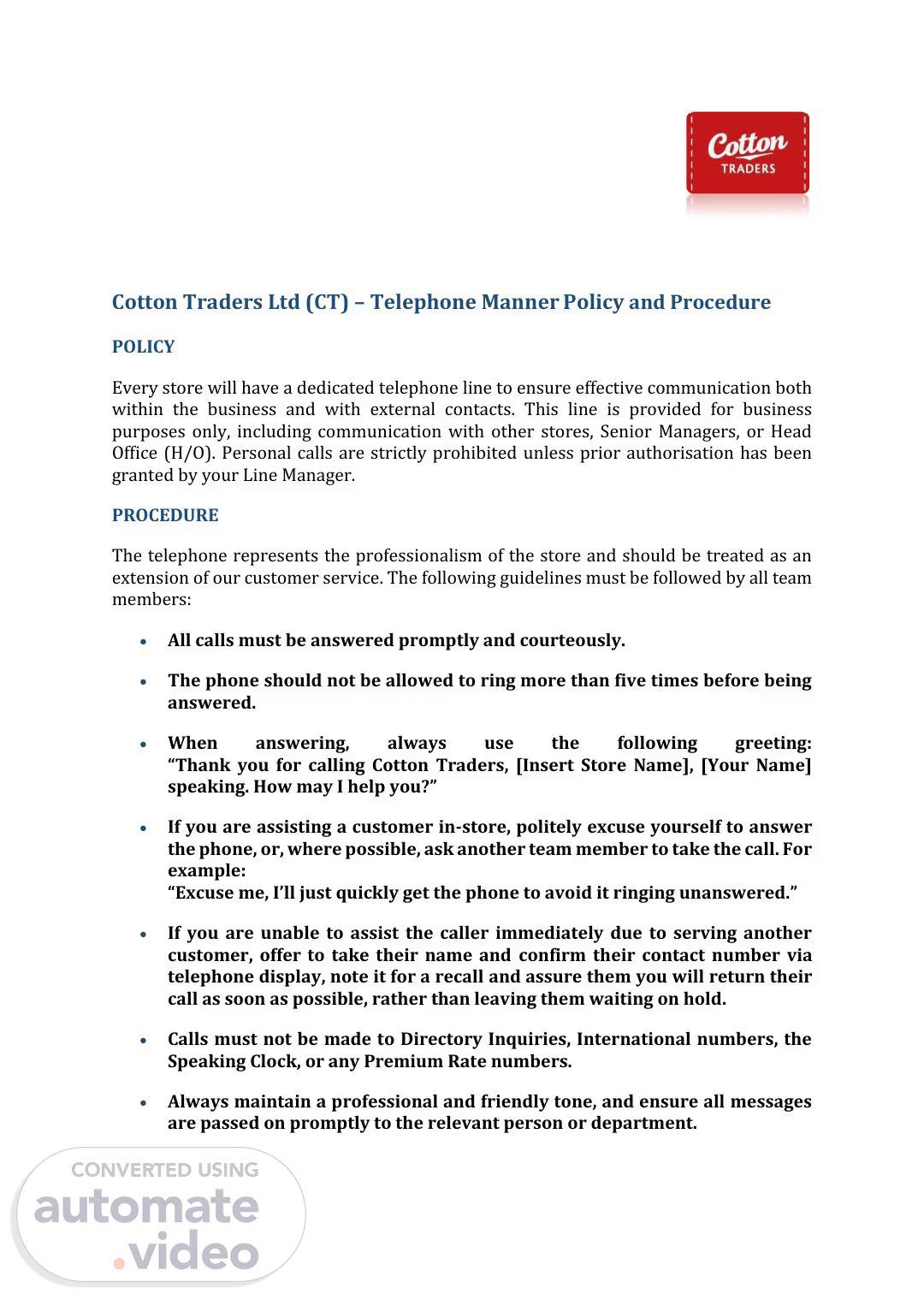 [Audio] Cotton Traders Ltd (CT) – Telephone Manner Policy and Procedure POLICY Every store will have a dedicated telephone line to ensure effective communication both within the business and with external contacts. This line is provided for business purposes only, including communication with other stores, Senior Managers, or Head Office (H/O). Personal calls are strictly prohibited unless prior authorisation has been granted by your Line Manager. PROCEDURE The telephone represents the professionalism of the store and should be treated as an extension of our customer service. The following guidelines must be followed by all team members: All calls must be answered promptly and courteously. The phone should not be allowed to ring more than five times before being answered. When answering, always use the following greeting: "Thank you for calling Cotton Traders, [Insert Store Name], [Your Name] speaking. How may I help you?" If you are assisting a customer in-store, politely excuse yourself to answer the phone, or, where possible, ask another team member to take the call. For example: "Excuse me, I'll just quickly get the phone to avoid it ringing unanswered." If you are unable to assist the caller immediately due to serving another customer, offer to take their name and confirm their contact number via telephone display, note it for a recall and assure them you will return their call as soon as possible, rather than leaving them waiting on hold. Calls must not be made to Directory Inquiries, International numbers, the Speaking Clock, or any Premium Rate numbers. Always maintain a professional and friendly tone, and ensure all messages are passed on promptly to the relevant person or department..