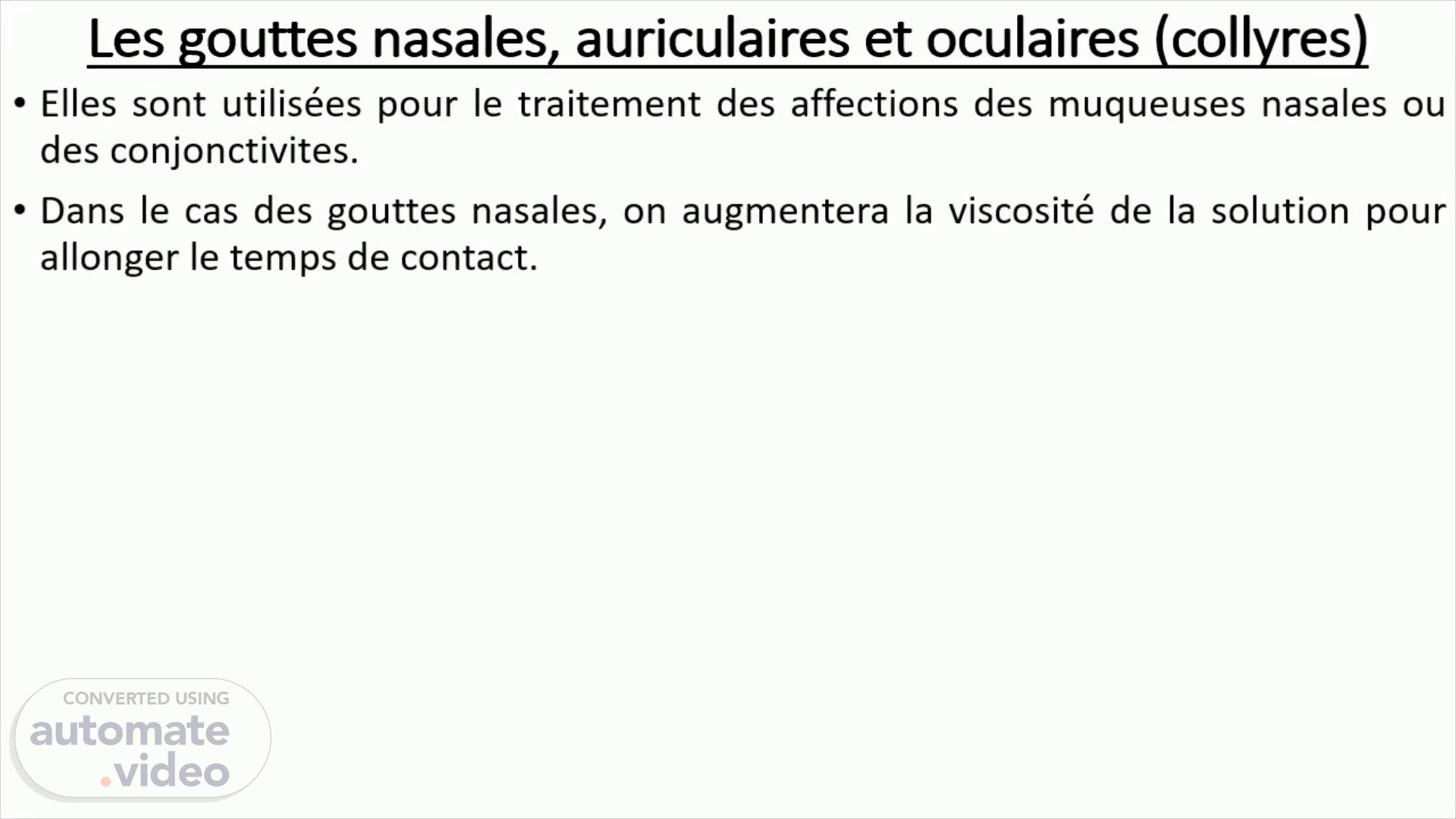 Collyres Propriétés des collyres Limpidité microfiltration Neutralité pH du liquide lacrymal entre 7,4 et 7,7 Le collyre doit avoir un pH proche de celui du liquide lacrymal, ainsi il sera indolore Utilisation de mélanges tampons phosphates, borates Isotonie Le collyre doit avoir la meme pression osmotique que les larmes.