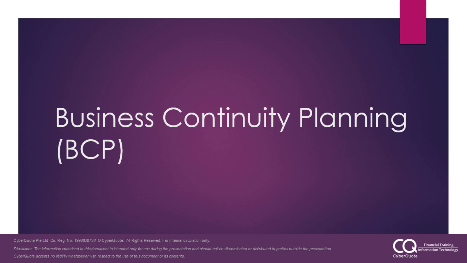 [Audio] Learning Objectives At the end of this training, you would gain an understanding on: What is Business Continuity Planning (BCP)? Key Components of a BCP Framework Essentials for Fintech Companies in Singapore BCP Template Structure Future Development Case Studies.