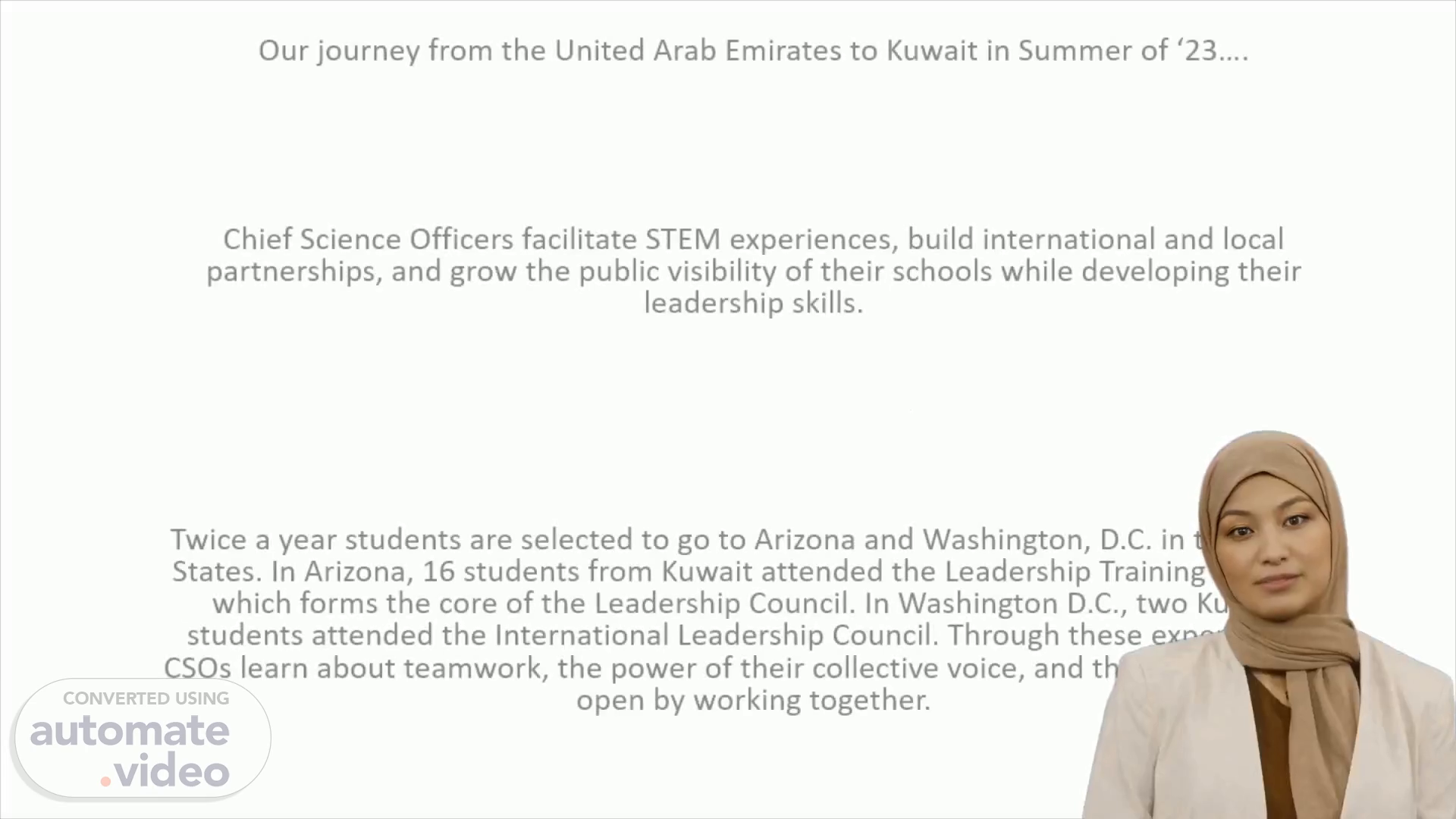 [Virtual Presenter] This unique program has enabled students from Kuwait to gain valuable leadership and team-building skills, while building bridges between their own communities and those of their international counterparts. Through the international Leadership Council, Kuwaiti students have had the opportunity to work with representatives from other countries and develop a deeper sense of team and collective purpose. At the Leadership Training Institute, students from Kuwait have gained invaluable experience of working with peers from other nations, culminating in the powerful impact of their collective voice..