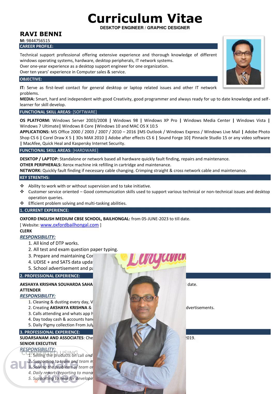 Curriculum Vitae DESKTOP ENGINEER / GRAPHIC DESIGNER RAVI BENNI M: 9844756515 CAREER PROFILE: Technical support professional offering extensive experience and thorough knowledge of different windows operating systems, hardware, desktop peripherals, IT network systems. Over one-year experience as a desktop support engineer for one organization. Over ten years’ experience in Computer sales & service. OBJECTIVE: IT: Serve as first-level contact for general desktop or laptop related issues and other IT network problems. MEDIA: Smart, hard and independent with good Creativity, good programmer and always ready for up to date knowledge and self- learner for skill develop. FUNCTIONAL SKILL AREAS: [SOFTWARE] OS PLATFORM: Windows Server 2003/2008 | Windows 98 | Windows XP Pro | Windows Media Center | Windows Vista | Windows 7 Ultimate| Windows 8 Core |Windows 10 and MAC OS X 10.5 APPLICATIONS: MS Office 2000 / 2003 / 2007 / 2010 – 2016 |MS Outlook / Windows Express / Windows Live Mail | Adobe Photo Shop CS 6 | Corel Draw X 5 | 3Ds MAX 2010 | Adobe after effects CS 6 | Sound Forge 10| Pinnacle Studio 15 or any video software | MacAfee, Quick Heal and Kaspersky Internet Security. FUNCTIONAL SKILL AREAS: [HARDWARE] DESKTOP / LAPTOP: Standalone or network based all hardware quickly fault finding, repairs and maintenance. OTHER PERIPHERALS: Xerox machine ink refilling in cartridge and maintenance. NETWORK: Quickly fault finding if necessary cable changing. Crimping straight & cross network cable and maintenance. KEY STRENTHS: Ability to work with or without supervision and to take initiative. Customer service oriented – Good communication skills used to support various technical or non-technical issues and desktop operation queries. Efficient problem solving and multi-tasking abilities. 1. CURRENT EXPERIENCE: OXFORD ENGLISH MEDIUM CBSE SCHOOL, BAILHONGAL: from 05-JUNE-2023 to till date. [ Website: www.oxfordbailhongal.com ] CLERK RESPONSIBILITY: 1. All kind of DTP works. 2. All test and exam question paper typing. 3. Prepare and maintaining Consolidate sheets. 4. UDISE + and SATS data updating. 5. School advertisement and pamphlet making. 2. PROFESSIONAL EXPERIENCE: AKSHAYA KRISHNA SOUHARDA SAHAKARI LTD, BAILHONGAL: from 02-JAN-2022 to till date. ATTENDER RESPONSIBILITY: 1. Cleaning & dusting every day, Voucher entry (manual & system entry) 2. Creating AKSHAYA KRISHNA & HAREKRISHNA FOUNDATION digital Banners & advertisements. 3. Calls attending and whats app handling. 4. Day today cash & accounts handling from Nov 2022 to till date. 5. Daily Pigmy collection From July 2022 to till date. 3. PROFESSIONAL EXPERIENCE: SUDARSANAM AND ASSOCIATES: Chennai, Tamil Nadu from 12-DEC-2018 to 07-MAR-2019. SENIOR EXECUTIVE RESPONSIBILITY: 1. Selling the products on call and solving the customer’s problems. 2. Supporting to team and team members. 3. Solving the problems of team and reporting to management. 4. Daily reports reporting to management. 5. Supporting to help for developing in project and software upgrade..