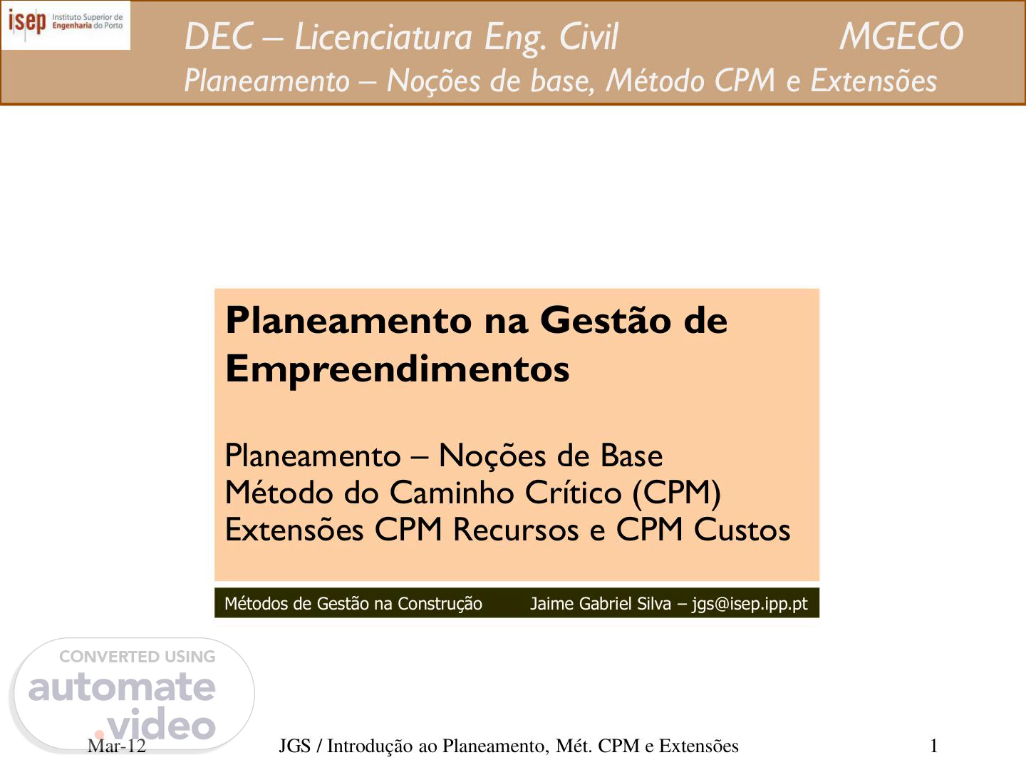 Mar-12 JGS / Introdução ao Planeamento, Mét. CPM e Extensões 1 Métodos de Gestão na Construção Jaime Gabriel Silva – [email protected] Planeamento na Gestão de Empreendimentos Planeamento – Noções de Base Método do Caminho Crítico (CPM) Extensões CPM Recursos e CPM Custos DEC – Licenciatura Eng. Civil MGECO Planeamento – Noções de base, Método CPM e Extensões.