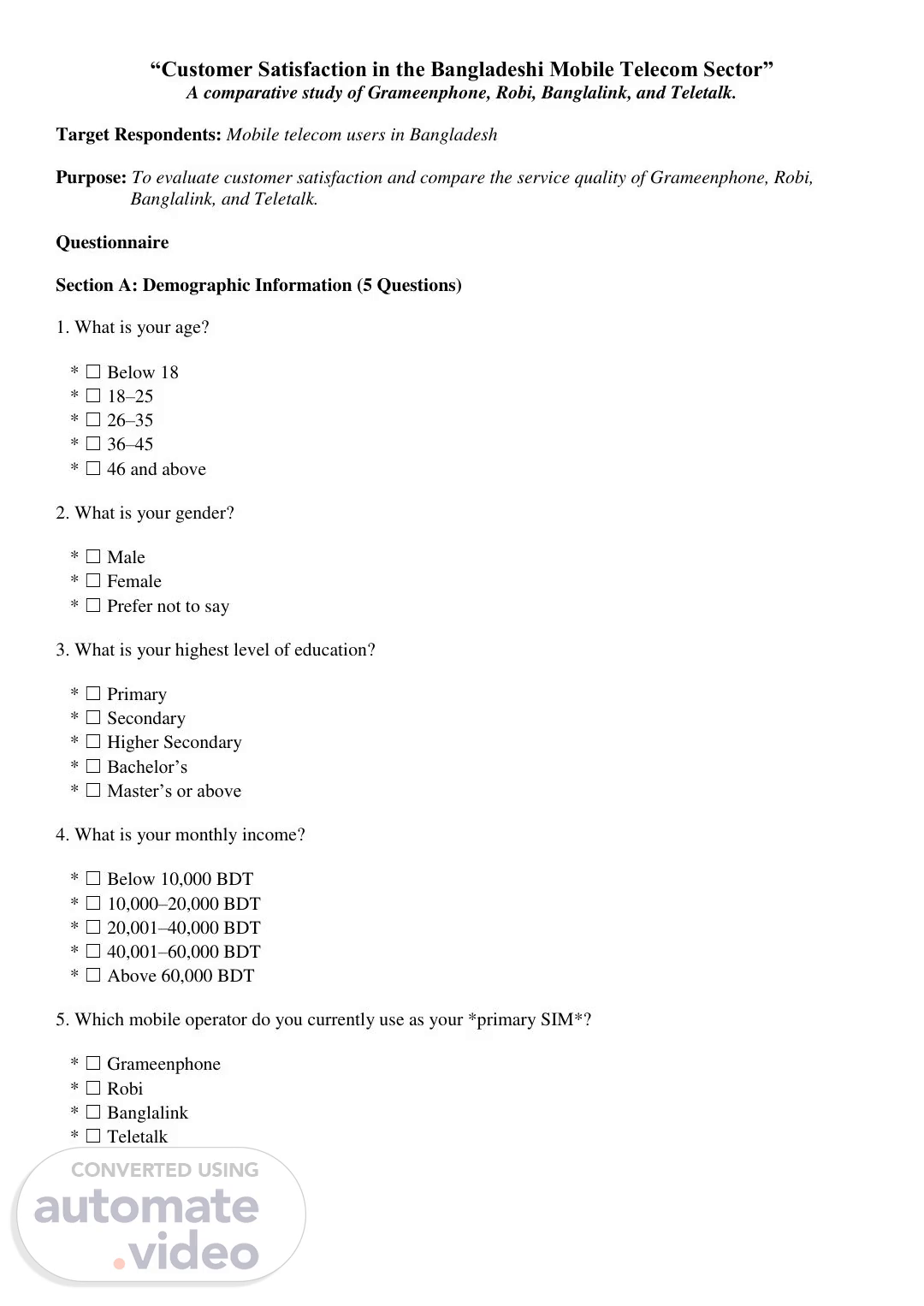 “Customer Satisfaction in the Bangladeshi Mobile Telecom Sector” A comparative study of Grameenphone, Robi, Banglalink, and Teletalk. Target Respondents: Mobile telecom users in Bangladesh Purpose: To evaluate customer satisfaction and compare the service quality of Grameenphone, Robi, Banglalink, and Teletalk. Questionnaire Section A: Demographic Information (5 Questions) 1. What is your age? * ☐ Below 18 * ☐ 18–25 * ☐ 26–35 * ☐ 36–45 * ☐ 46 and above 2. What is your gender? * ☐ Male * ☐ Female * ☐ Prefer not to say 3. What is your highest level of education? * ☐ Primary * ☐ Secondary * ☐ Higher Secondary * ☐ Bachelor’s * ☐ Master’s or above 4. What is your monthly income? * ☐ Below 10,000 BDT * ☐ 10,000–20,000 BDT * ☐ 20,001–40,000 BDT * ☐ 40,001–60,000 BDT * ☐ Above 60,000 BDT 5. Which mobile operator do you currently use as your *primary SIM*? * ☐ Grameenphone * ☐ Robi * ☐ Banglalink * ☐ Teletalk.