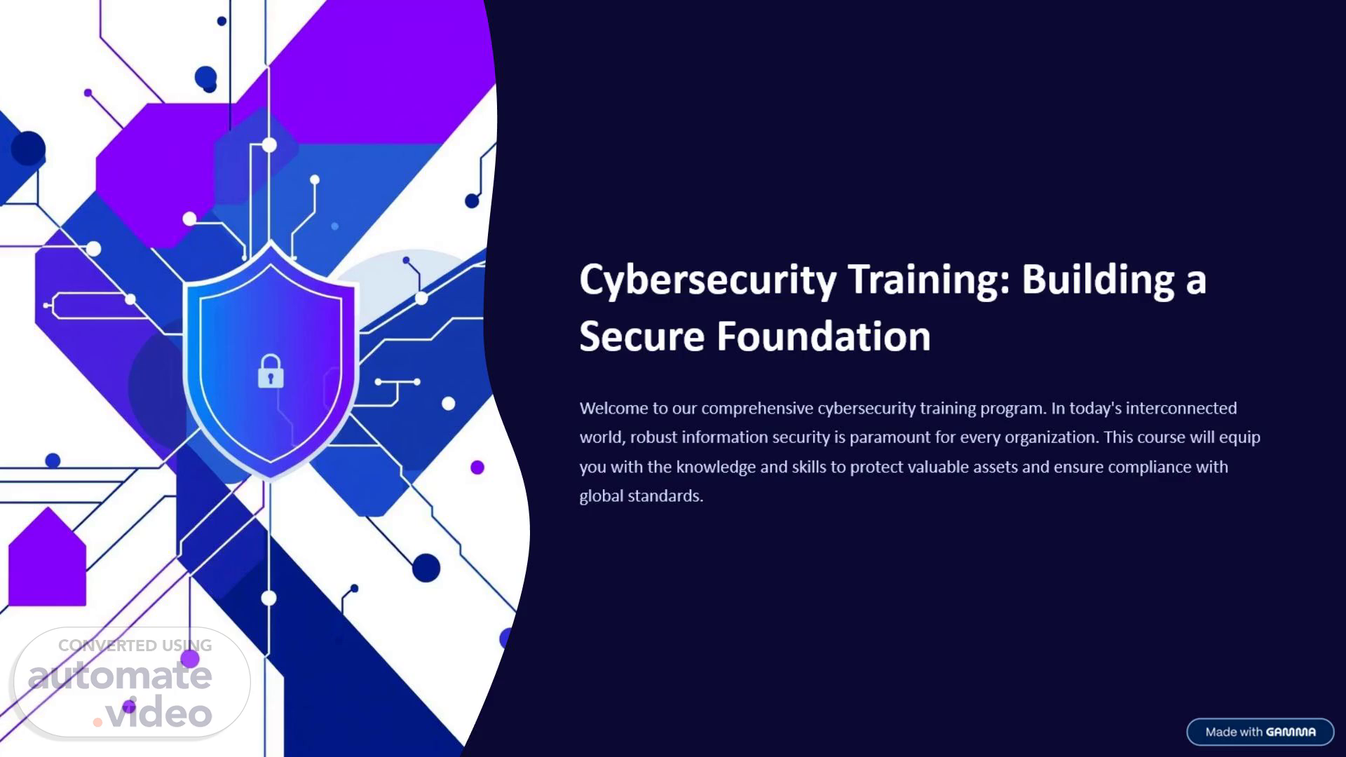 [Audio] Cybersecurity Training: Building a Secure Foundation Welcome to our comprehensive cybersecurity training program. In today's interconnected world, robust information security is paramount for every organization. This course will equip you with the knowledge and skills to protect valuable assets and ensure compliance with global standards..