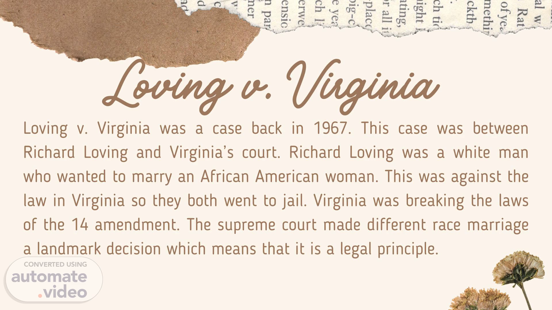 Loving v. Virginia was a case back in 1967. This case was between Richard Loving and Virginia's court. Richard Loving was a white man who wanted to marry an African American woman. This was against the law in Virginia so they both went to jail. Virginia was breaking the laws of the 14 amendment. The supreme court made different race marriage a landmark decision which means that it is a legal principle..