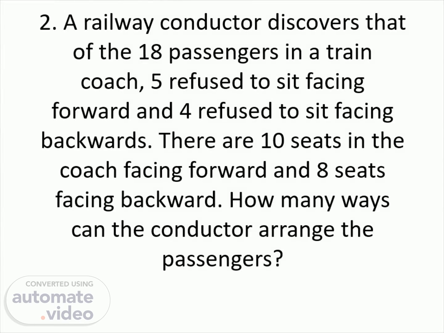 2. A railway conductor discovers that of the 18 passengers in a train coach, 5 refused to sit facing forward and 4 refused to sit facing backwards. There are 10 seats in the coach facing forward and 8 seats facing backward. How many ways can the conductor arrange the passengers?.