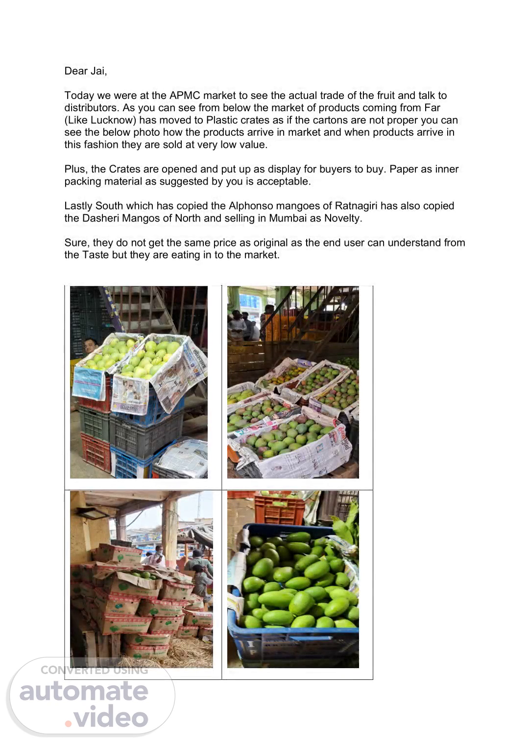 [Audio] So in a Nut shell the Practices as below: 1. Dasheri Mangoes need to be packed as Green as the transit time is 2- 3 days and normally the buyers at APMC, the whole sellers are ripening (using Ethylene spray) and selling in market. 2. Packing: There are two different types of traders: a. Only Carton packing: They use 5 Kgs and 10 kgs Carton boxes. Both these sizes are your regular sizes as you mentioned so please let me know the exact dimension and the gross weight. b. Only Crate Packing: The Crate 540 mm x 360 mm x 290 mm. If one use then using recycled crates and if returnable then using Virgin crates. The Weight of crates is app 1.6 kgs. plus paper packing material, plus 20 kgs mangoes. Whatever the Gross weight of the crate they reduce by 2 Kgs and that is net weight. 3. Transport: Normally either 7-8 MT in Eicher trucks or 10 MT in regular trucks. 4. Product Category: a. Supreme: Average weight min 300 Gms each. b. Super: Average weight min 250 gms each The buyers normally open few boxes or Crates and check each pc of Mango. The intension is to show if any bad or looks bad or small size so that they can negotiate the price down. But after few rounds once they get the confidence then sealed Carton and crates move. The next steps as below: 1. Finalise the carton sizes and the cost of the cartons for the 5 & 10 kgs and recycled Crates (one use) in Black or Dark Blue or Dark Yellow. The Recycled Carats (New) target prices is app Rs 80 to 125 per crate. You also get Second hand crates at lower price but need to be careful on contamination and breakage. 2. The grading and sorting of the Dasheri fruits is the next key step. You need as discussed get the product to your Factory Veranda and use your present potatoes grading and sorting team to sort the product. 3. For the Trade we suggest to develop a brand say " Uday- Hind" or " Jay- Hind" which will be printed on each carton along with the nutritional facts of Mangoes and a MRP based on say Rs 100 to 150/ Kgs ( we can decide later) So 5 Kgs Carton MRP will be Rs 500 based on Rs 100/ Kg. 4. For the crate packing please have a cardboard cover (with the Brand, MPR etc.) and one or two straps on the crate. 5. Last week May we will give you the price and quantity indication based on which by 1st to 5th June one Eicher load each of Cartons and crates to be delivered to Mumbai APMC. 6. This will be the samples and based on samples sales and feeds back from market we will by end of week 1 June will advise the Price and the quantity and packing needed for next 15 days. 7. Supply to start by 15th June and the price and delivery forecast will be send 7 days in advance for you to plan stock and Packing material. 8. 15th June to 15th July the prices will be higher and then start tapering down..