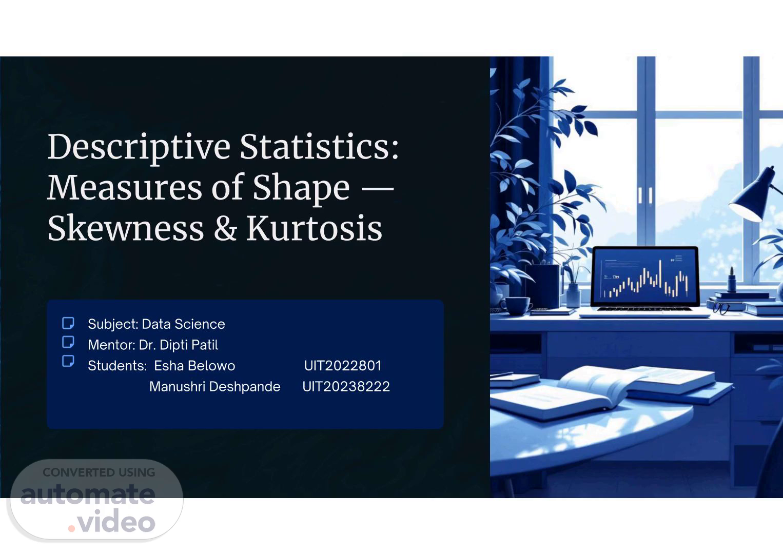 Descriptive Statistics: Measures of Shape — Skewness & Kurtosis Subject: Data Science Mentor: Dr. Dipti Patil Students: Esha Belowo Manushri Deshpande UIT2022801 UIT20238222.