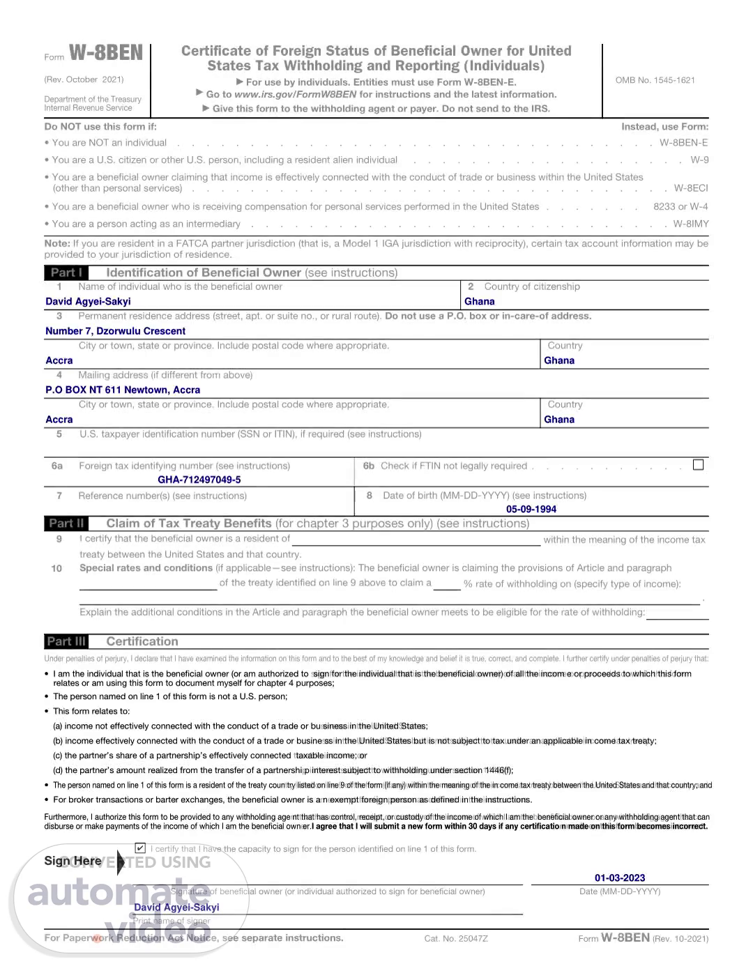 [Audio] Form W-8BEN (Rev. October 2021) Department of the Treasury Internal Revenue Service Certificate of Foreign Status of Beneficial Owner for United States Tax Withholding and Reporting (Individuals) ▶ For use by individuals. Entities must use Form W-8BEN-E. ▶ Go to www.irs.gov/FormW8BEN for instructions and the latest information. ▶ Give this form to the withholding agent or payer. Do not send to the IRS. OMB No. 1545-1621 Do NOT use this form if: Instead, use Form: • You are NOT an individual . . . . . . . . . . . . . . . . . . . . . . . . . . . . . . . . . W-8BEN-E • You are a U.S. citizen or other U.S. person, including a resident alien individual . . . . . . . . . . . . . . . . . . . W-9 • You are a beneficial owner claiming that income is effectively connected with the conduct of trade or business within the United States (other than personal services) . . . . . . . . . . . . . . . . . . . . . . . . . . . . . . . . . W-8ECI • You are a beneficial owner who is receiving compensation for personal services performed in the United States . . . . . . . 8233 or W-4 • You are a person acting as an intermediary . . . . . . . . . . . . . . . . . . . . . . . . . . . . . W-8IMY Note: If you are resident in a FATCA partner jurisdiction (that is, a Model 1 IGA jurisdiction with reciprocity), certain tax account information may be provided to your jurisdiction of residence. Part I Identification of Beneficial Owner (see instructions) 1 Name of individual who is the beneficial owner 2 Country of citizenship 3 Permanent residence address (street, apt. or suite no., or rural route). Do not use a P.O. box or in-care-of address. City or town, state or province. Include postal code where appropriate. Country 4 Mailing address (if different from above) City or town, state or province. Include postal code where appropriate. Country 5 U.S. taxpayer identification number (SSN or ITIN), if required (see instructions) 6a Foreign tax identifying number (see instructions) 6b Check if FTIN not legally required . . . . . . . . . . . 7 Reference number(s) (see instructions) 8 Date of birth (MM-DD-YYYY) (see instructions) Part II Claim of Tax Treaty Benefits (for chapter 3 purposes only) (see instructions) 9 I certify that the beneficial owner is a resident of within the meaning of the income tax treaty between the United States and that country. 10 Special rates and conditions (if applicable—see instructions): The beneficial owner is claiming the provisions of Article and paragraph of the treaty identified on line 9 above to claim a % rate of withholding on (specify type of income): . Explain the additional conditions in the Article and paragraph the beneficial owner meets to be eligible for the rate of withholding: Part III Certification Under penalties of perjury, I declare that I have examined the information on this form and to the best of my knowledge and belief it is true, correct, and complete. I further certify under penalties of perjury that: • I am the individual that is the beneficial owner (or am authorized to sign for the individual that is the beneficial owner) of all the income or proceeds to which this form relates or am using this form to document myself for chapter 4 purposes; • The.