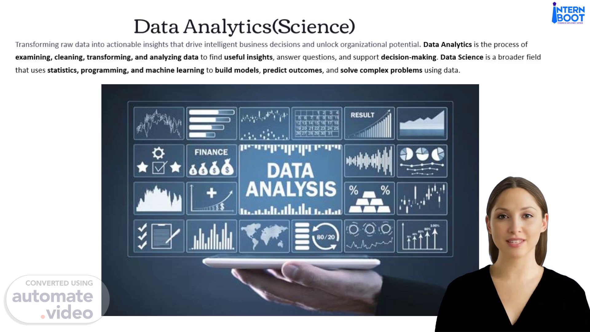 [Virtual Presenter] Data Analytics is a systematic process that involves collecting, cleaning, analyzing, and visualizing data to extract meaningful insights and support informed decision-making. This process enables organizations to transform raw information into actionable intelligence, which can inform strategy across various functions within the organization. Data Analytics also encompasses a broader field known as Data Science, which utilizes advanced statistical methods, programming, and machine learning techniques to build predictive models, analyze complex patterns, and solve intricate problems. By applying these methodologies, organizations can harness the power of data to drive business success and stay competitive in today's fast-paced market..
