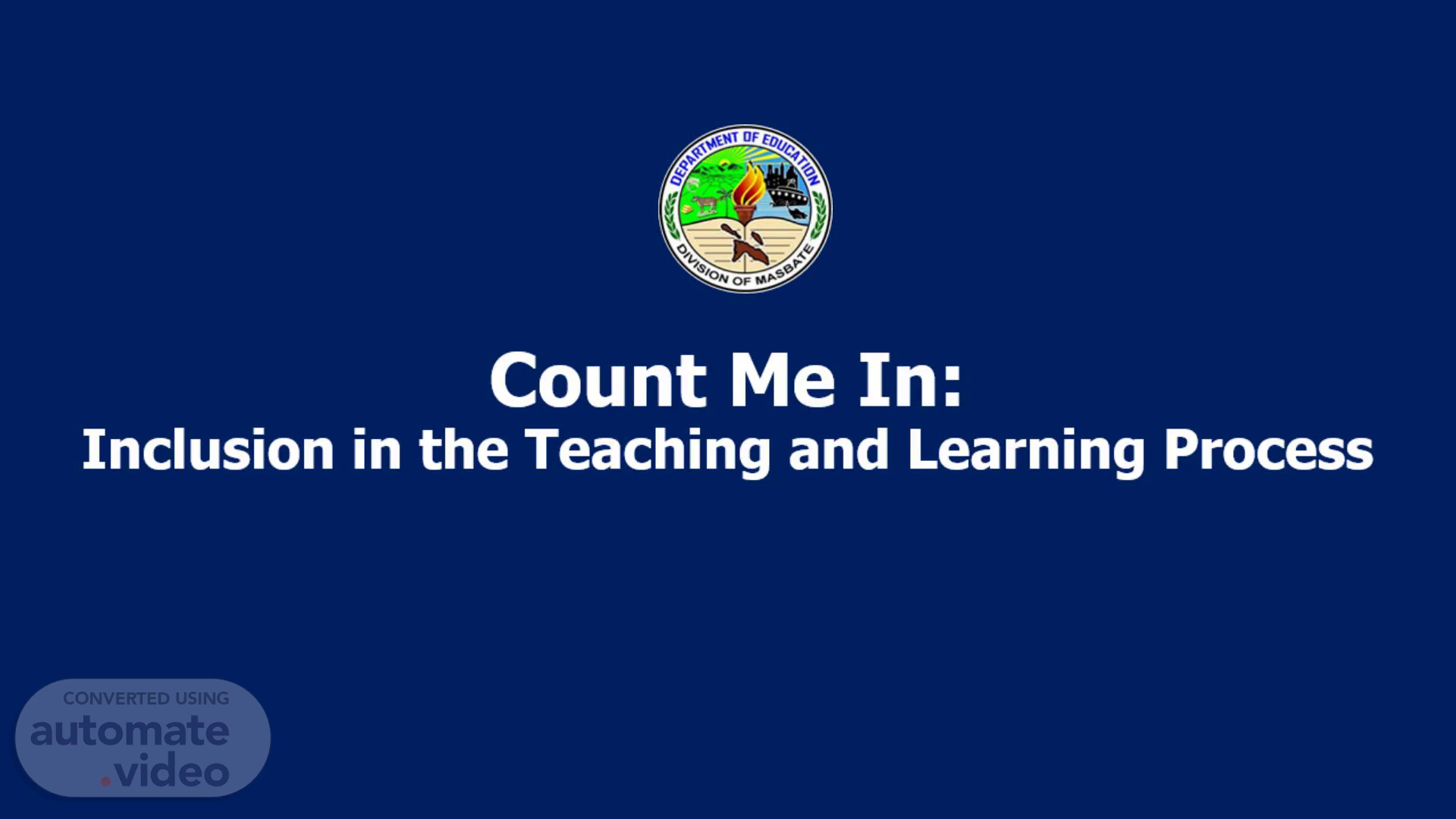 [Audio] Count Me In: Inclusion in the Teaching and Learning Process Hello everyone! Yesterday we trekked the mountain of learning in making our schools resilient and empowered in emergent situations. Yes, we also have unlocked the chest to a child-friendly school. We need to remember that champions as we are do not stop learning. Today, we have the full accountability to be better in transcending child-friendliness into our classrooms through inclusion. Learn with me. Together, let's say: "Count Me In: Inclusion in the Teaching and Learning Process." Welcome to our first session!.