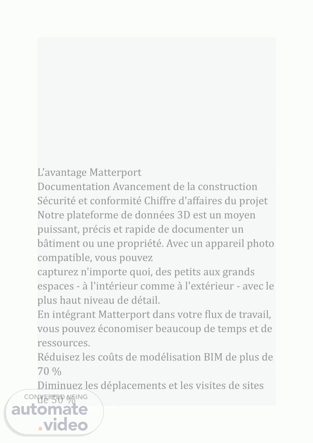 [Audio] Découvrez la technologie de jumeau numérique de Matterport, le moyen complet de rationaliser ;lux de travail de votre projet en tirant parti de notre technologie de capture 3D pour accélérer le site Documentation, création conforme à l' exécution et collaboration des parties prenantes à tout moment et en tout lieu. L' avantage Matterport Documentation Avancement de la construction Sécurité et conformité Chiffre d'affaires du projet Notre plateforme de données 3D est un moyen puissant, précis et rapide de documenter un bâtiment ou une propriété. Avec un appareil photo compatible, vous pouvez capturez n'importe quoi, des petits aux grands espaces - à l' intérieur comme à l' extérieur - avec le plus haut niveau de détail. En intégrant Matterport dans votre ;lux de travail, vous pouvez économiser beaucoup de temps et de ressources. Réduisez les coûts de modélisation BIM de plus de 70 % Diminuez les déplacements et les visites de sites de 50 [ break]%.