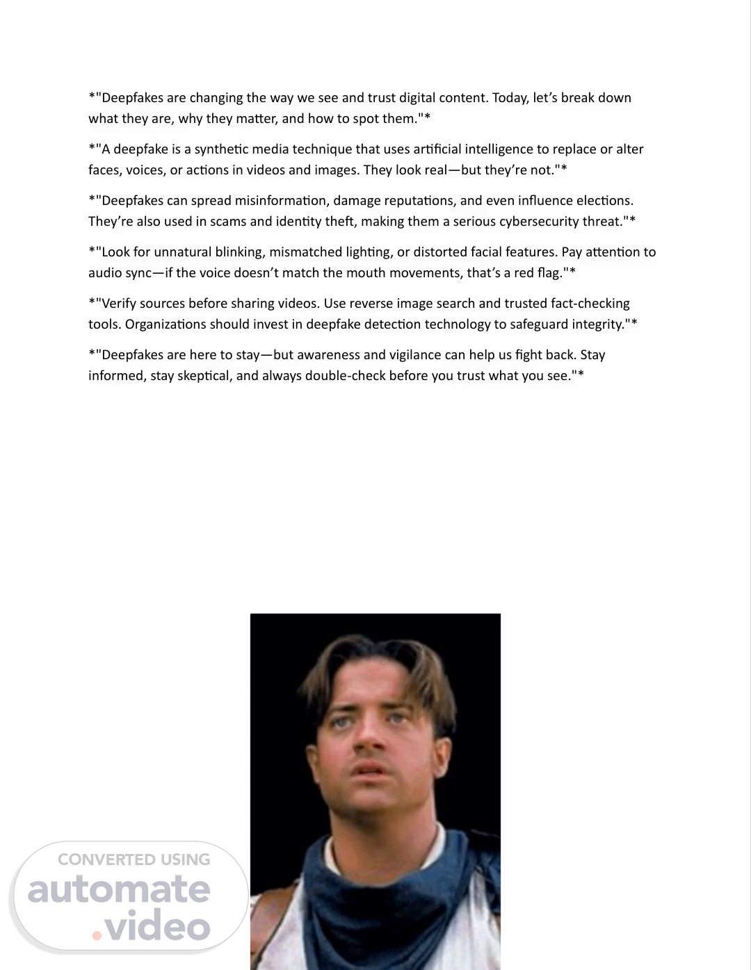 *"Deepfakes are changing the way we see and trust digital content. Today, let’s break down what they are, why they matter, and how to spot them."* *"A deepfake is a synthetic media technique that uses artificial intelligence to replace or alter faces, voices, or actions in videos and images. They look real—but they’re not."* *"Deepfakes can spread misinformation, damage reputations, and even influence elections. They’re also used in scams and identity theft, making them a serious cybersecurity threat."* *"Look for unnatural blinking, mismatched lighting, or distorted facial features. Pay attention to audio sync—if the voice doesn’t match the mouth movements, that’s a red flag."* *"Verify sources before sharing videos. Use reverse image search and trusted fact-checking tools. Organizations should invest in deepfake detection technology to safeguard integrity."* *"Deepfakes are here to stay—but awareness and vigilance can help us fight back. Stay informed, stay skeptical, and always double-check before you trust what you see."*.