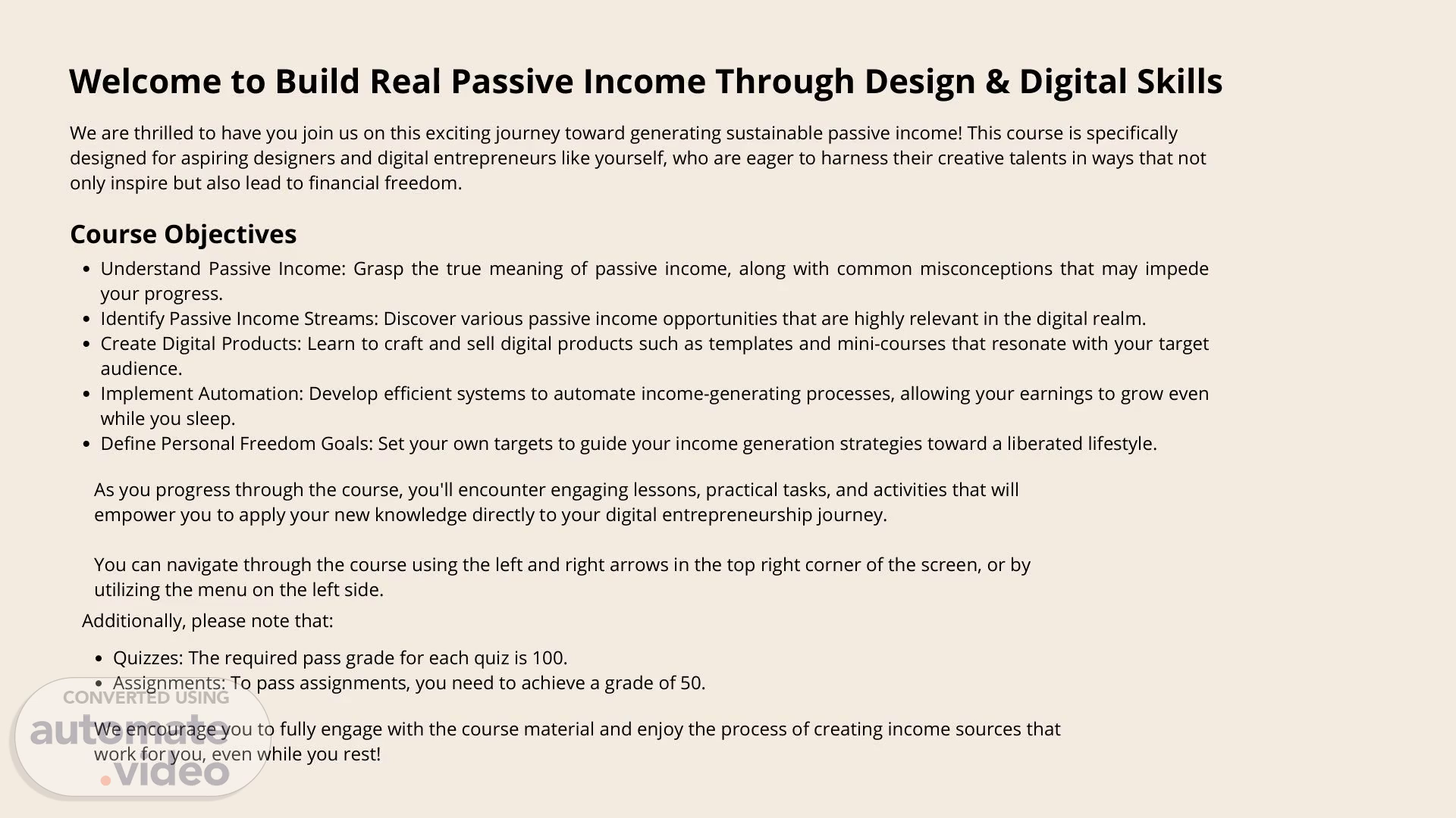 [Audio] Welcome to Build Real Passive Income Through Design & Digital Skills We are thrilled to have you join us on this exciting journey toward generating sustainable passive income! This course is specifically designed for aspiring designers and digital entrepreneurs like yourself, who are eager to harness their creative talents in ways that not only inspire but also lead to financial freedom. Course Objectives Understand Passive Income: Grasp the true meaning of passive income, along with common misconceptions that may impede your progress. Identify Passive Income Streams: Discover various passive income opportunities that are highly relevant in the digital realm. Create Digital Products: Learn to craft and sell digital products such as templates and mini-courses that resonate with your target audience. Implement Automation: Develop efficient systems to automate income-generating processes, allowing your earnings to grow even while you sleep. Define Personal Freedom Goals: Set your own targets to guide your income generation strategies toward a liberated lifestyle. As you progress through the course, you'll encounter engaging lessons, practical tasks, and activities that will empower you to apply your new knowledge directly to your digital entrepreneurship journey. You can navigate through the course using the left and right arrows in the top right corner of the screen, or by utilizing the menu on the left side. Additionally, please note that: Quizzes: The required pass grade for each quiz is 100. Assignments: To pass assignments, you need to achieve a grade of 50. We encourage you to fully engage with the course material and enjoy the process of creating income sources that work for you, even while you rest!.