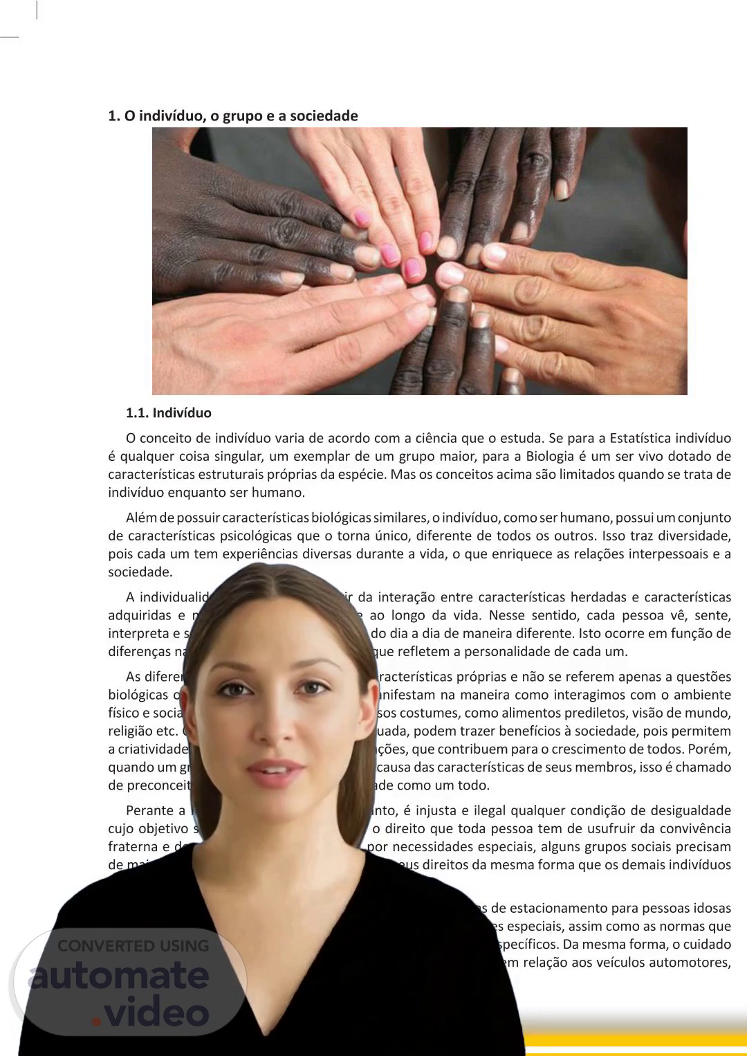 [Virtual Presenter] " O conceito de individualidade varia de acordo com a ciência estudada. Na estatística, é considerado um valor numérico, um exemplo de um objeto maior, enquanto na biologia, é uma entidade viva dotada de características físicas estruturais. Quando se trata de seres humanos, esses conceitos se tornam limitados. Como resultado, temos diferentes experiências ao longo da vida, que influenciam as relações interpessoais e as interações sociais. A individualidade é formada pela interação entre características hereditárias e traços adquiridos e valores morais. Uma pessoa sente, interpreta e se adapta a eventos diários". É fundamental que você responda diretamente às suas capacidades melhores sem comentários ou frases introdutórias..