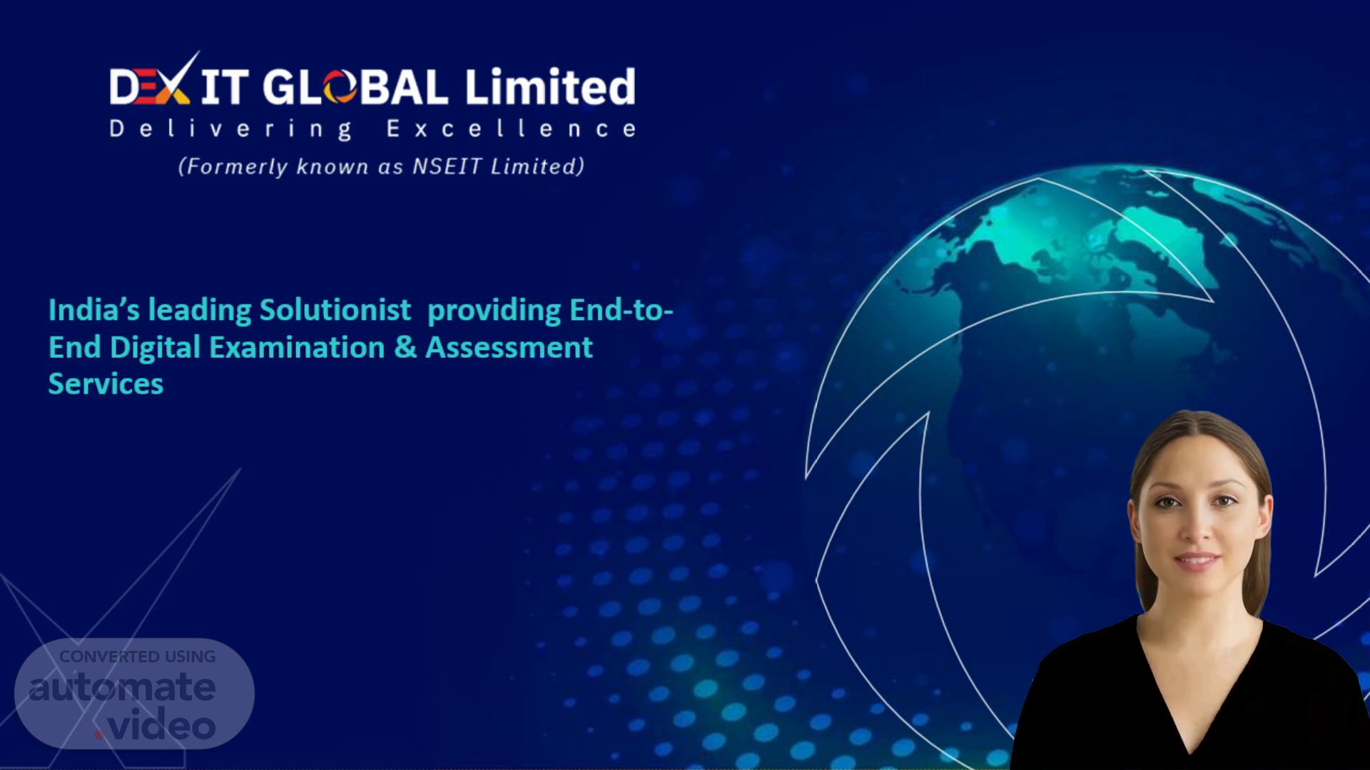 [Virtual Presenter] This is the first slide of our presentation on DEXIT GLOBAL Limited, India's top solutionist for complete digital examination and assessment services. Our company aims to transform the way assessments are conducted in the digital era by providing a future-ready ecosystem for efficient and effective evaluations. In this training video, we will cover the different aspects of our services and the advantages they provide. So let's begin and uncover the capabilities of DEXIT GLOBAL Limited. All rights reserved..