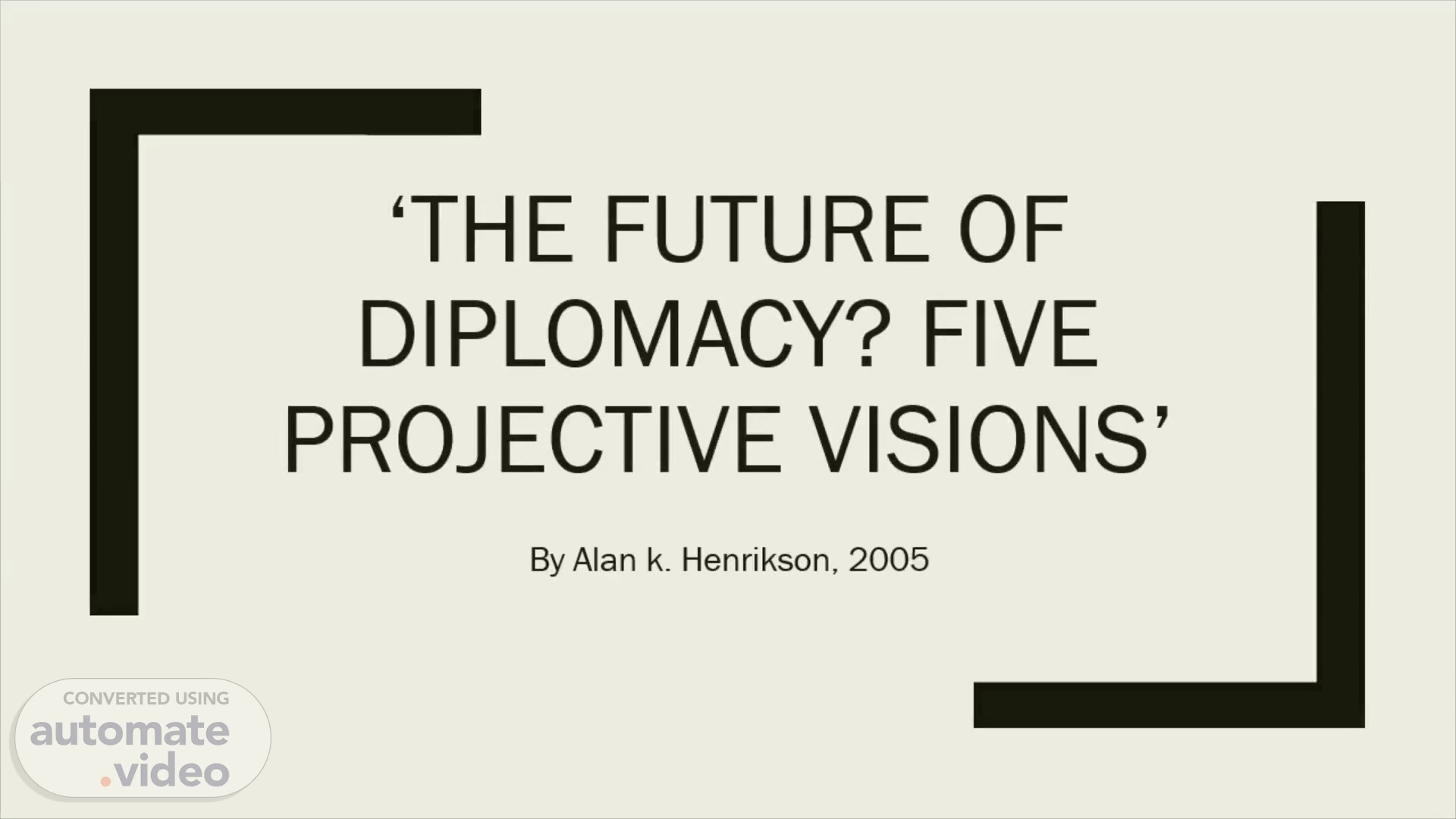 The motive behind writing the article. The article ‘The Future of Diplomacy? Five Projective Visions’ was written by the author in the year 2005 and through this article he expected to make a series of claims and predictions about the future of diplomacy between various nations based on the historical laws and events that have been seen in the nineteenth century before. Henrikson believes that making such conscious future predictions is of immense importance since due to increasing globalization and a hastening history has pushed world leaders and diplomats around the globe to make urgent decisions in a precise manner..