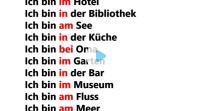 Ich bin in der Schule Ich bin im Urlaub Ich bin im Restaurant Ich bin zu Hause Ich bin auf dem Balkon Ich bin im Park Ich bin im Bad Ich bin im Hotel Ich bin in der Bibliothek Ich bin am See Ich bin i