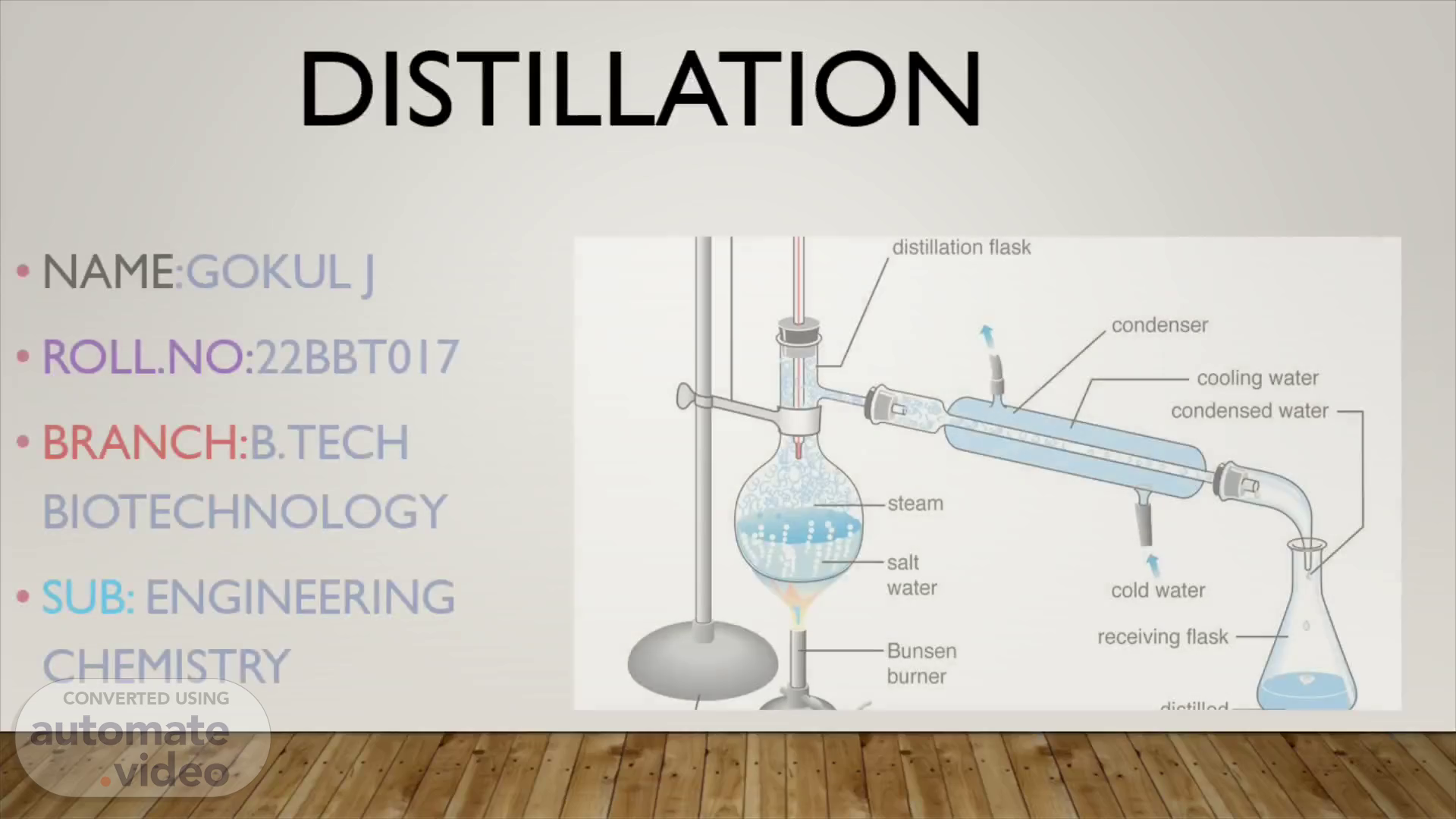 DISTILLATION. NAME :GOKUL J ROLL.NO: 22BBT017 BRANCH: B.TECH BIOTECHNOLOGY SUB: ENGINEERING CHEMISTRY.