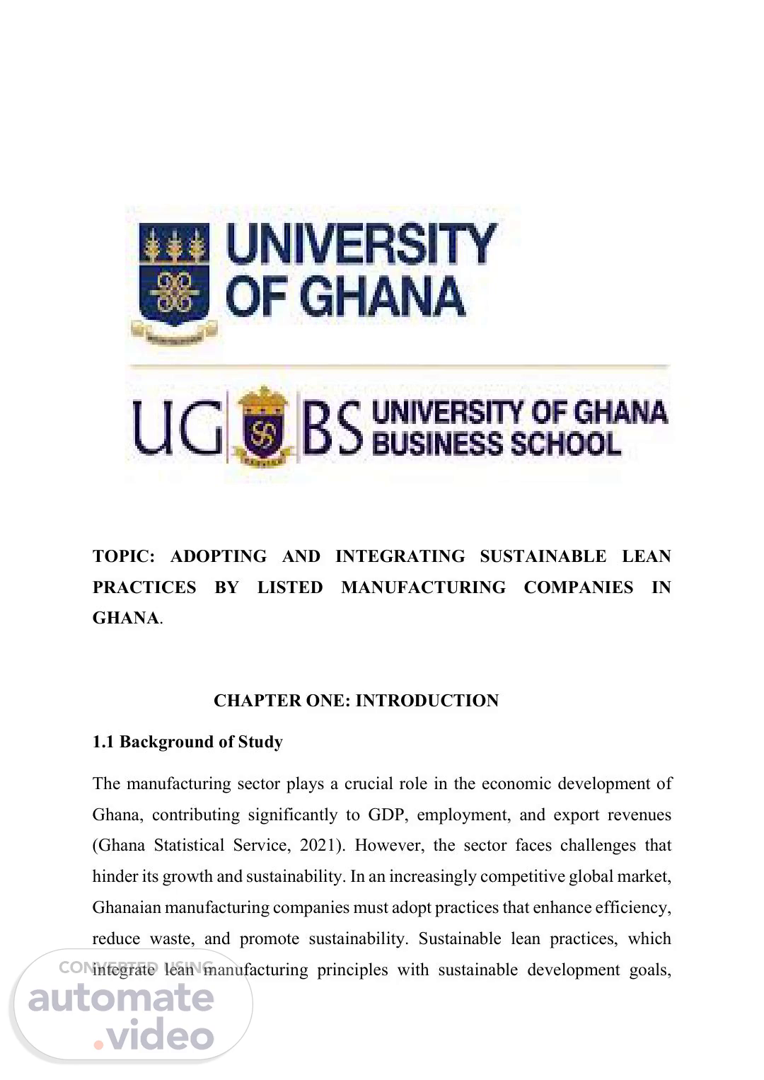 TOPIC: ADOPTING AND INTEGRATING SUSTAINABLE LEAN PRACTICES BY LISTED MANUFACTURING COMPANIES IN GHANA. CHAPTER ONE: INTRODUCTION 1.1 Background of Study The manufacturing sector plays a crucial role in the economic development of Ghana, contributing significantly to GDP, employment, and export revenues (Ghana Statistical Service, 2021). However, the sector faces challenges that hinder its growth and sustainability. In an increasingly competitive global market, Ghanaian manufacturing companies must adopt practices that enhance efficiency, reduce waste, and promote sustainability. Sustainable lean practices, which integrate lean manufacturing principles with sustainable development goals,.