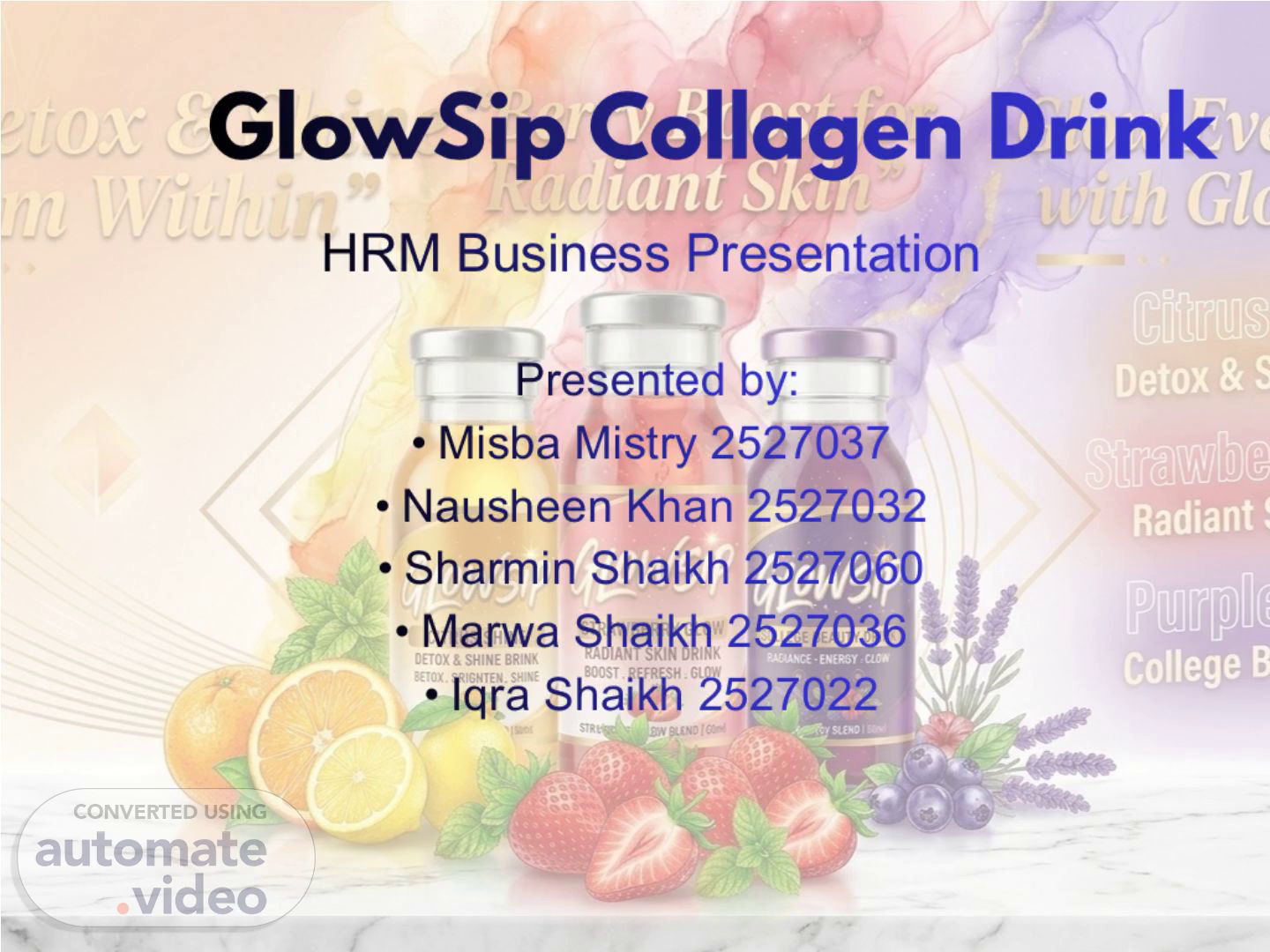 GlowSip Collagen Drink. HRM Business Presentation Presented by: Misba Mistry 2527037 Nausheen Khan 2527032 Sharmin Shaikh 2527060 Marwa Shaikh 2527036 Iqra Shaikh 2527022.