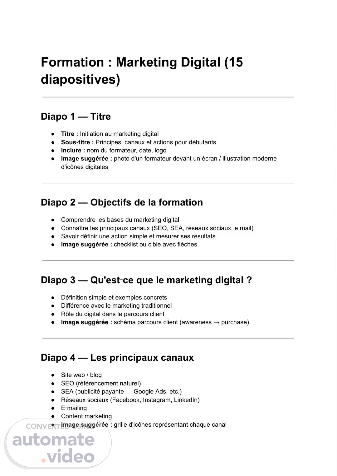 Formation : Marketing Digital (15 diapositives) Diapo 1 — Titre ● Titre : Initiation au marketing digital ● Sous-titre : Principes, canaux et actions pour débutants ● Inclure : nom du formateur, date, logo ● Image suggérée : photo d'un formateur devant un écran / illustration moderne d'icônes digitales Diapo 2 — Objectifs de la formation ● Comprendre les bases du marketing digital ● Connaître les principaux canaux (SEO, SEA, réseaux sociaux, e‑mail) ● Savoir définir une action simple et mesurer ses résultats ● Image suggérée : checklist ou cible avec flèches Diapo 3 — Qu'est‑ce que le marketing digital ? ● Définition simple et exemples concrets ● Différence avec le marketing traditionnel ● Rôle du digital dans le parcours client ● Image suggérée : schéma parcours client (awareness → purchase) Diapo 4 — Les principaux canaux ● Site web / blog ● SEO (référencement naturel) ● SEA (publicité payante — Google Ads, etc.) ● Réseaux sociaux (Facebook, Instagram, LinkedIn) ● E‑mailing ● Content marketing ● Image suggérée : grille d'icônes représentant chaque canal.