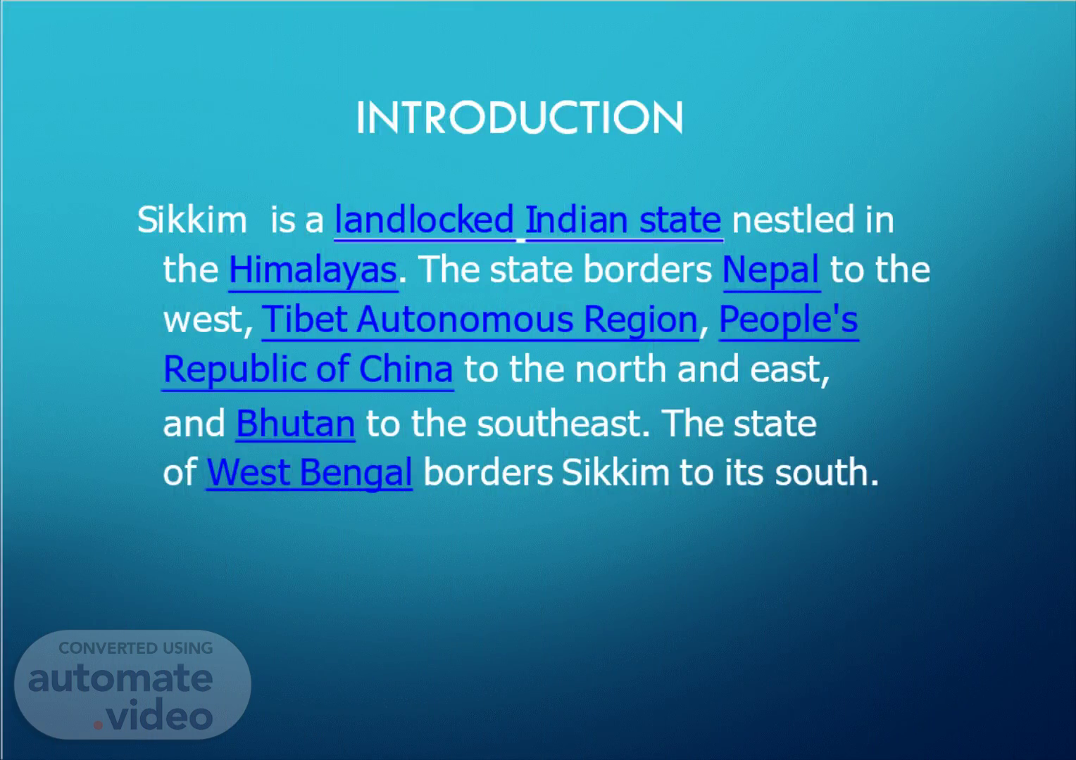 INTRODUCTION. S i k k i m is a l a n d l o c k ed I n d i a n s t a t e nestled in the Himalayas . The state borders Nepal to the w e s t , Tibet Autonomous Region , P e o p l e ' s Republic of China to the north and east, and Bhutan to the southeast. The state of West Bengal borders Sikkim to its south..