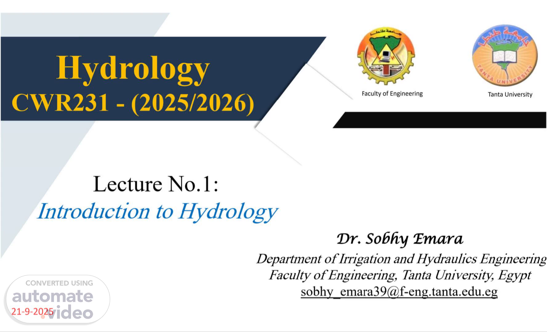 Hydrology CWR231 - (2025/2026) Lecture No. 1 : Introduction to Hydrology 4 Tanta University Faculty of Engineering Dr. Sobhy Emara Department of Irrigation and Hydraulics Engineering] Faculty of Engineering, Tanta University, Egypt sobhy [email protected] 21-9-2025.