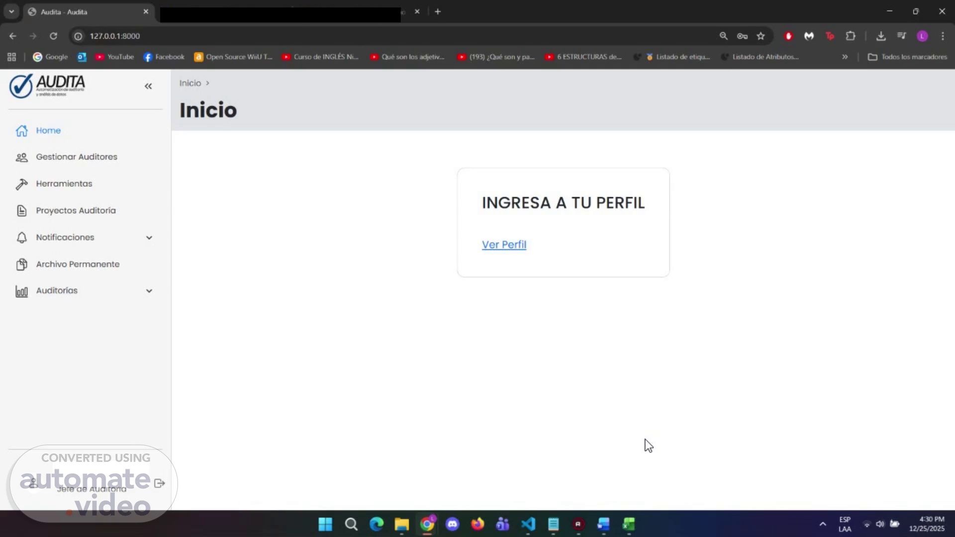 (8.433) . X e•' gear tu C @ 1210.0.1:8000 Google • Yourutr Vacebook Ogx•n Stngcr WiitJ • de INGLfS • los x$etiv... • (193) iQué son y INGRESA A TU PERFIL Ver los rn.Mc:Üres AUDITA Home Gestionar Auditores Herramientas Proyectos Auditoria Notificaciones Archivo Permanente Auditorias Luis Ångel Calderon Jefe de Auditoria Inicio > Inicio o.
