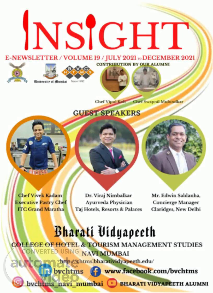 AUGUST 2021 Outlook-ICARE Rankings 2021: India's Top 30 Private Hotel Management Institutes, “BVCHTMS Ranked 12 th “ Webinar on Sommellerie as a Career by Mr. Gagan Sharma Webinar on Hospitality Series 8.0 by Ms. Soni Kamthan, Training Hospitality Professionals for the Last 25 Years, on “Essence of Personality Development Webinar on Hospitality Series 9.0 by Mr. Robin Fernandes, Professional Trainer for Karcher on “Whatever the Cleaning Task We have the Solution” Webinar on “Career in Hospitality” By Dr. Wilson Lukose, Principal BVCHTMS & Alumni, Mr. Sunilkumar Panda, General Manager, Airways Hotel, Papua New Guinea & Mr. Amol Nerurkar, F & B Manager, Aloft, Delhi Webinar on Hospitality Series 10.0 by Prof. Priyeta Priyadarshini, BVIMSR on “Introduction to Human Resource Management & Current Human Resource Practices” Times of India Survey 2021 - BVCHTMS, Navi Mumbai been selected as One of the Top Five Hotel Management Colleges in Mumbai Hospitality Webinar series 11.0 On "New Normals of Hotel Industry" by Mr. Ranjeet Singh, Front Office Manager Taj City Center Gurugram (TCCG) Reimbursement given to BVCHTMS Staff suffering from COVID-19 through Bharati Vidyapeeth Insurance Policy SEPTEMBER 2021 Chef Aditya Joshi participated as a Jury Member in the Maharashtra State Skills Competition organized by Maharashtra State Skill Development Society DLLE Students participated in “Sapling Plantation Drive 2021” organized by Bharati Vidyapeeth Institute of Pharmacy BVCHTMS Students participated in Swacchta Pakhwada, Competition organized by India Tourism Mumbai - “Poster Making and Slogan Writing Competition” F&B Service Training Session conducted for Dental College and Architecture College Staff, Navi Mumbai 30 th Orientation Program – Chief Guest – Dr. Pawan Agrawal, Motivational Speaker Commencement of Semester 1 – BSc in Hospitality Studies (University of Mumbai) Course commenced from September 2021 - BSc in Hospitality and Hotel Administration affiliated to Bharati Vidyapeeth (Deemed to be University).