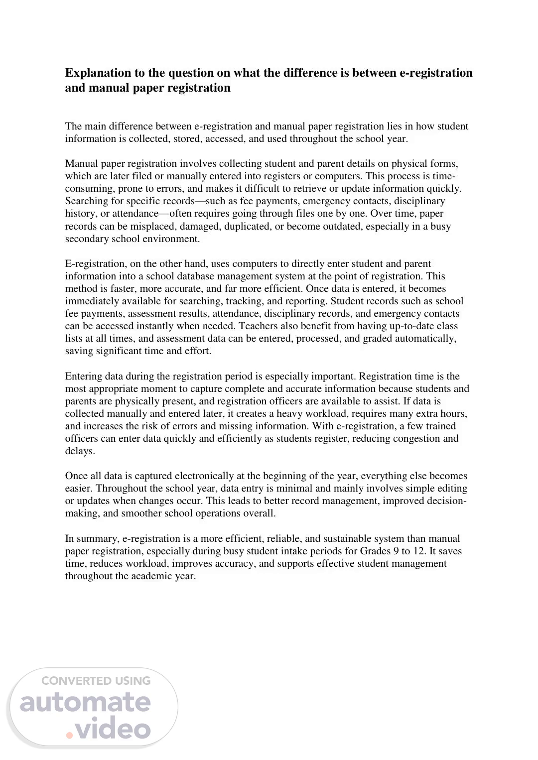 Explanation to the question on what the difference is between e-registration and manual paper registration The main difference between e-registration and manual paper registration lies in how student information is collected, stored, accessed, and used throughout the school year. Manual paper registration involves collecting student and parent details on physical forms, which are later filed or manually entered into registers or computers. This process is time- consuming, prone to errors, and makes it difficult to retrieve or update information quickly. Searching for specific records—such as fee payments, emergency contacts, disciplinary history, or attendance—often requires going through files one by one. Over time, paper records can be misplaced, damaged, duplicated, or become outdated, especially in a busy secondary school environment. E-registration, on the other hand, uses computers to directly enter student and parent information into a school database management system at the point of registration. This method is faster, more accurate, and far more efficient. Once data is entered, it becomes immediately available for searching, tracking, and reporting. Student records such as school fee payments, assessment results, attendance, disciplinary records, and emergency contacts can be accessed instantly when needed. Teachers also benefit from having up-to-date class lists at all times, and assessment data can be entered, processed, and graded automatically, saving significant time and effort. Entering data during the registration period is especially important. Registration time is the most appropriate moment to capture complete and accurate information because students and parents are physically present, and registration officers are available to assist. If data is collected manually and entered later, it creates a heavy workload, requires many extra hours, and increases the risk of errors and missing information. With e-registration, a few trained officers can enter data quickly and efficiently as students register, reducing congestion and delays. Once all data is captured electronically at the beginning of the year, everything else becomes easier. Throughout the school year, data entry is minimal and mainly involves simple editing or updates when changes occur. This leads to better record management, improved decision- making, and smoother school operations overall. In summary, e-registration is a more efficient, reliable, and sustainable system than manual paper registration, especially during busy student intake periods for Grades 9 to 12. It saves time, reduces workload, improves accuracy, and supports effective student management throughout the academic year..