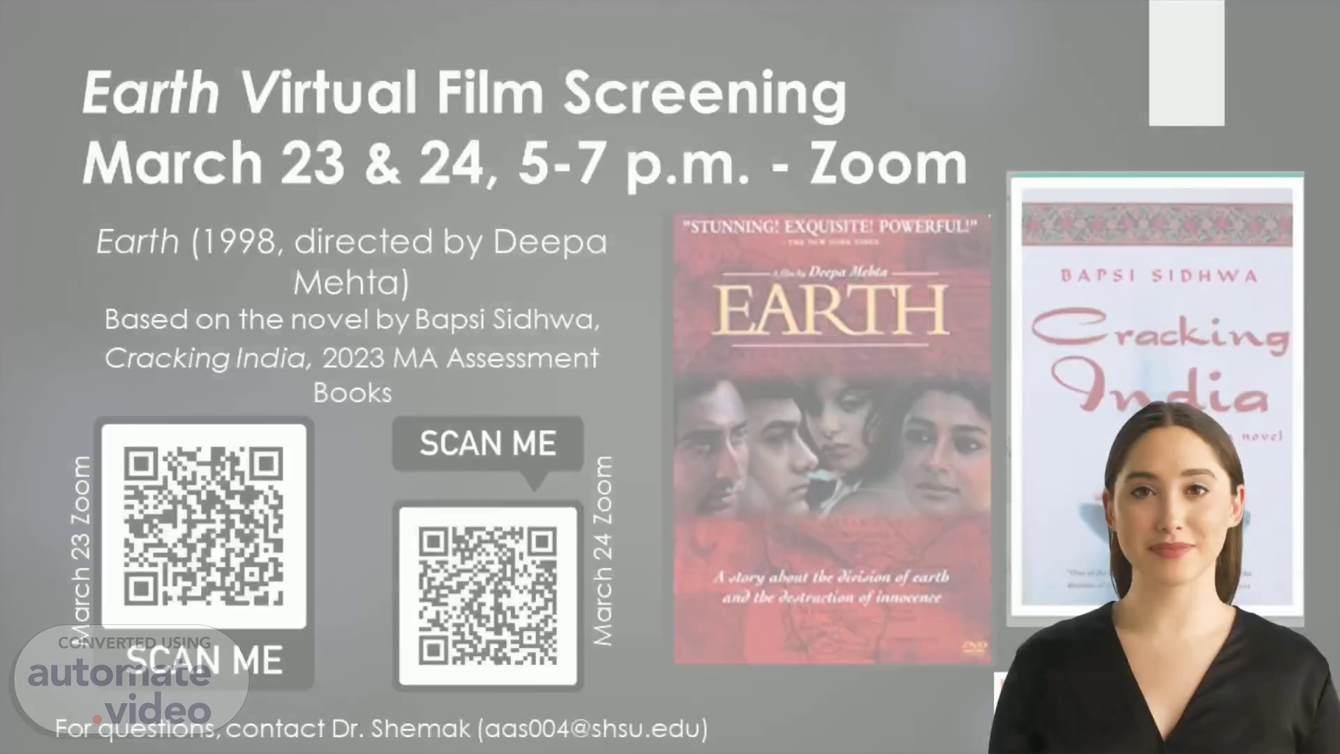 [Virtual Presenter] ""Earth", the groundbreaking film released in 1998, is based on Bapsi Sidhwa’s novel "Cracking India". This is the second film in Deepa Mehta’s “elements” trilogy, the first being "Fire" which was banned in India due to its plotline. The third film in the trilogy is "Water", dealing with the treatment of widows in India. This August marks the 75th anniversary of Indian Independence/Partition. This event marked the end of British colonizers governing and leaving India, though many scholars argue that the decisions to "carve up" India were hastily made by the British colonizers and led to the chaotic events of Partition. An understanding of the importance of "Earth" and the trilogy, I'm now ready to show you the film..