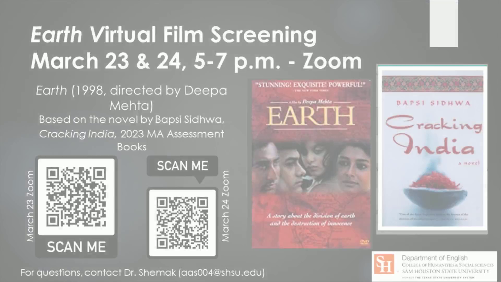 [Audio] Welcome to this virtual screening of the film Earth. I have a brief introduction to the film that I will show you now before we watch the film. As you know Earth is based on Bapsi Sidhwa's novel Cracking India. Earth is the second film in Deepa Mehta's "elements" trilogy. The first film was "Fire" and was banned in India because the lesbian relationship plotline. The third film in the trilogy is Water about the treatment of widows in India. The connecting theme in the trilogy is the impact of gender and sexuality on the lives of characters..