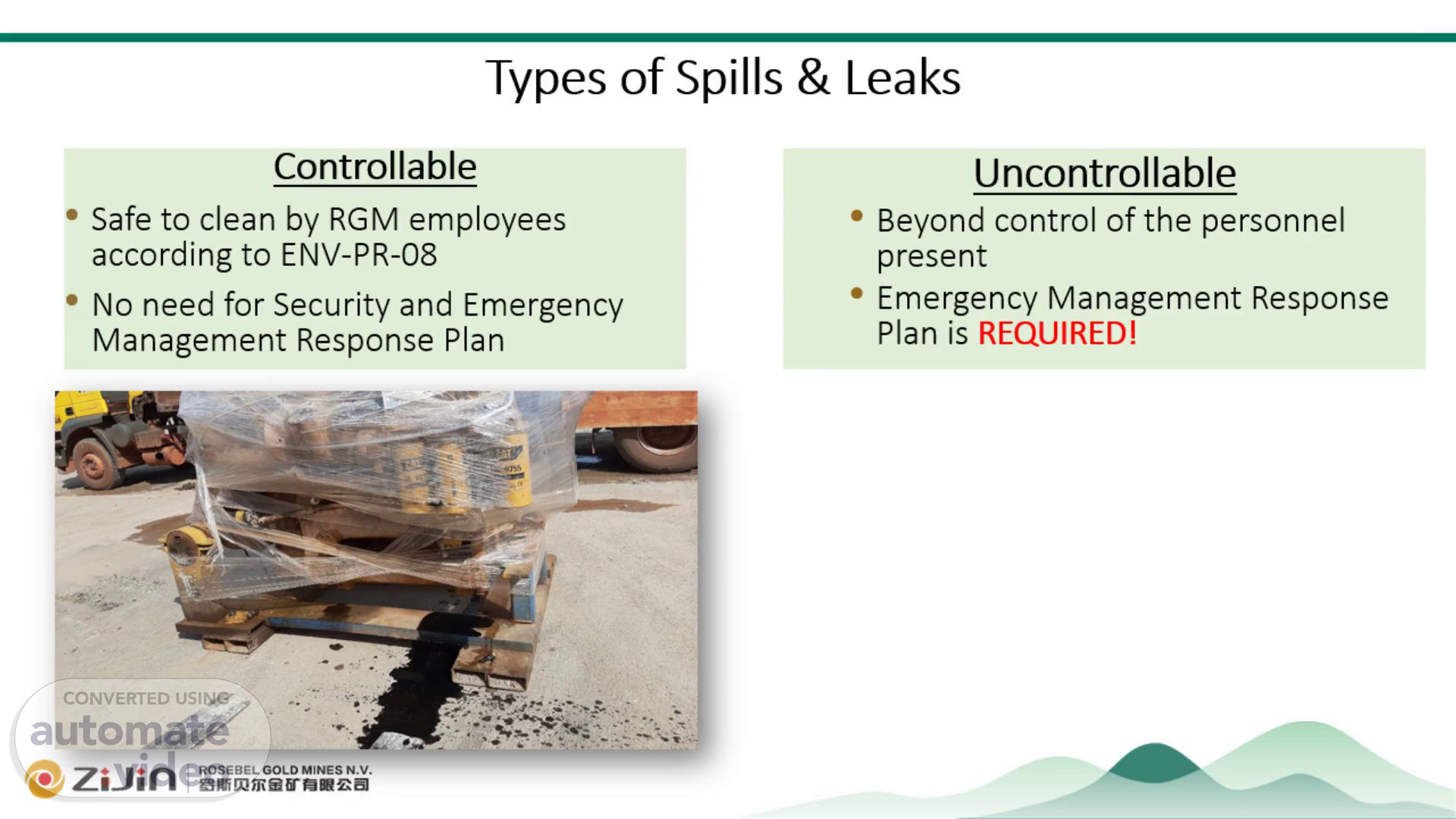 [Audio] Types of Spills. Spills are categorized into two types. Controllable spills are those that can be safely managed and cleaned by RGM employees. These do not require an Emergency Management Response Plan. Uncontrollable spills, on the other hand, are beyond normal control measures and require an Emergency Management Response Plan to effectively manage and reduce their impact. This classification ensures that the correct response is applied based on the severity of the spill..