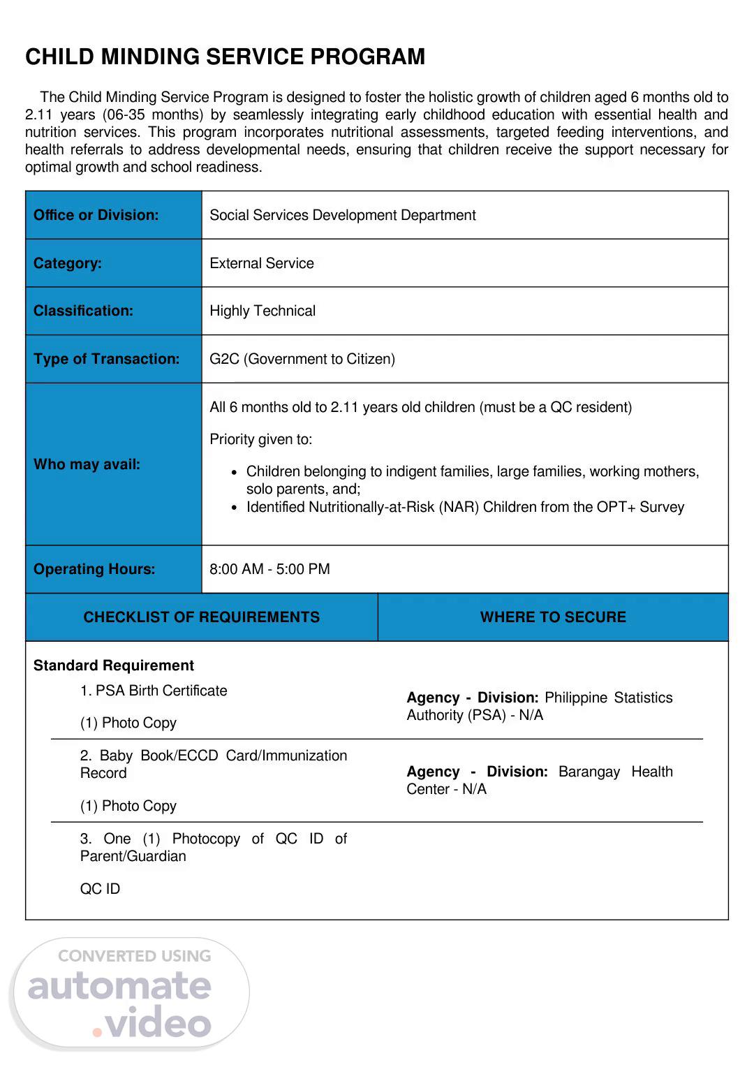 CHILD MINDING SERVICE PROGRAM The Child Minding Service Program is designed to foster the holistic growth of children aged 6 months old to 2.11 years (06-35 months) by seamlessly integrating early childhood education with essential health and nutrition services. This program incorporates nutritional assessments, targeted feeding interventions, and health referrals to address developmental needs, ensuring that children receive the support necessary for optimal growth and school readiness. Office or Division: Social Services Development Department Category: External Service Classification: Highly Technical Type of Transaction: G2C (Government to Citizen) Who may avail: All 6 months old to 2.11 years old children (must be a QC resident) Priority given to: Children belonging to indigent families, large families, working mothers, solo parents, and; Identified Nutritionally-at-Risk (NAR) Children from the OPT+ Survey Operating Hours: 8:00 AM - 5:00 PM CHECKLIST OF REQUIREMENTS WHERE TO SECURE Standard Requirement 1. PSA Birth Certificate (1) Photo Copy Agency - Division: Philippine Statistics Authority (PSA) - N/A 2. Baby Book/ECCD Card/Immunization Record (1) Photo Copy Agency - Division: Barangay Health Center - N/A 3. One (1) Photocopy of QC ID of Parent/Guardian QC ID.