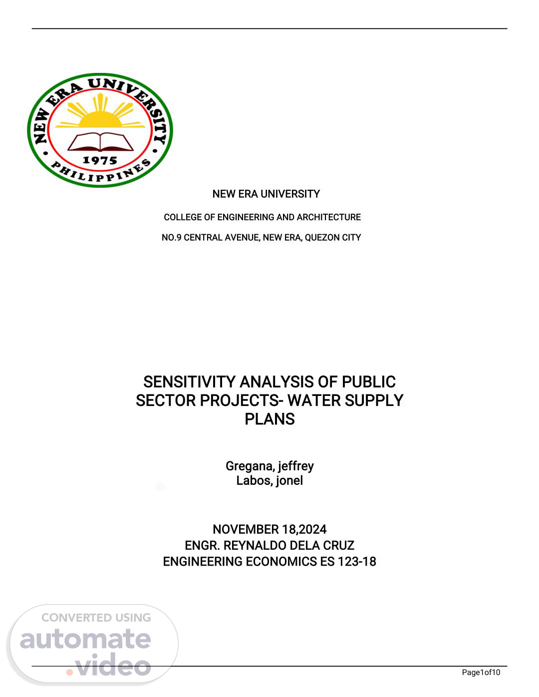 Page1of10 NEW ERA UNIVERSITY COLLEGE OF ENGINEERING AND ARCHITECTURE NO.9 CENTRAL AVENUE, NEW ERA, QUEZON CITY SENSITIVITY ANALYSIS OF PUBLIC SECTOR PROJECTS- WATER SUPPLY PLANS Gregana, jeffrey Labos, jonel NOVEMBER 18,2024 ENGR. REYNALDO DELA CRUZ ENGINEERING ECONOMICS ES 123-18.