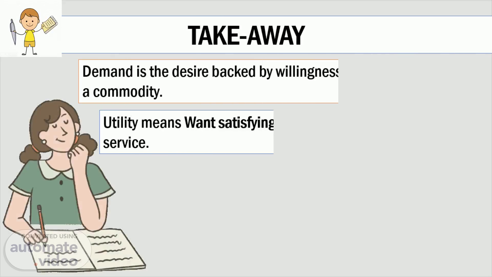 TAKE-AWAY. Utility means Want satisfying capacity of a commodity or a service..