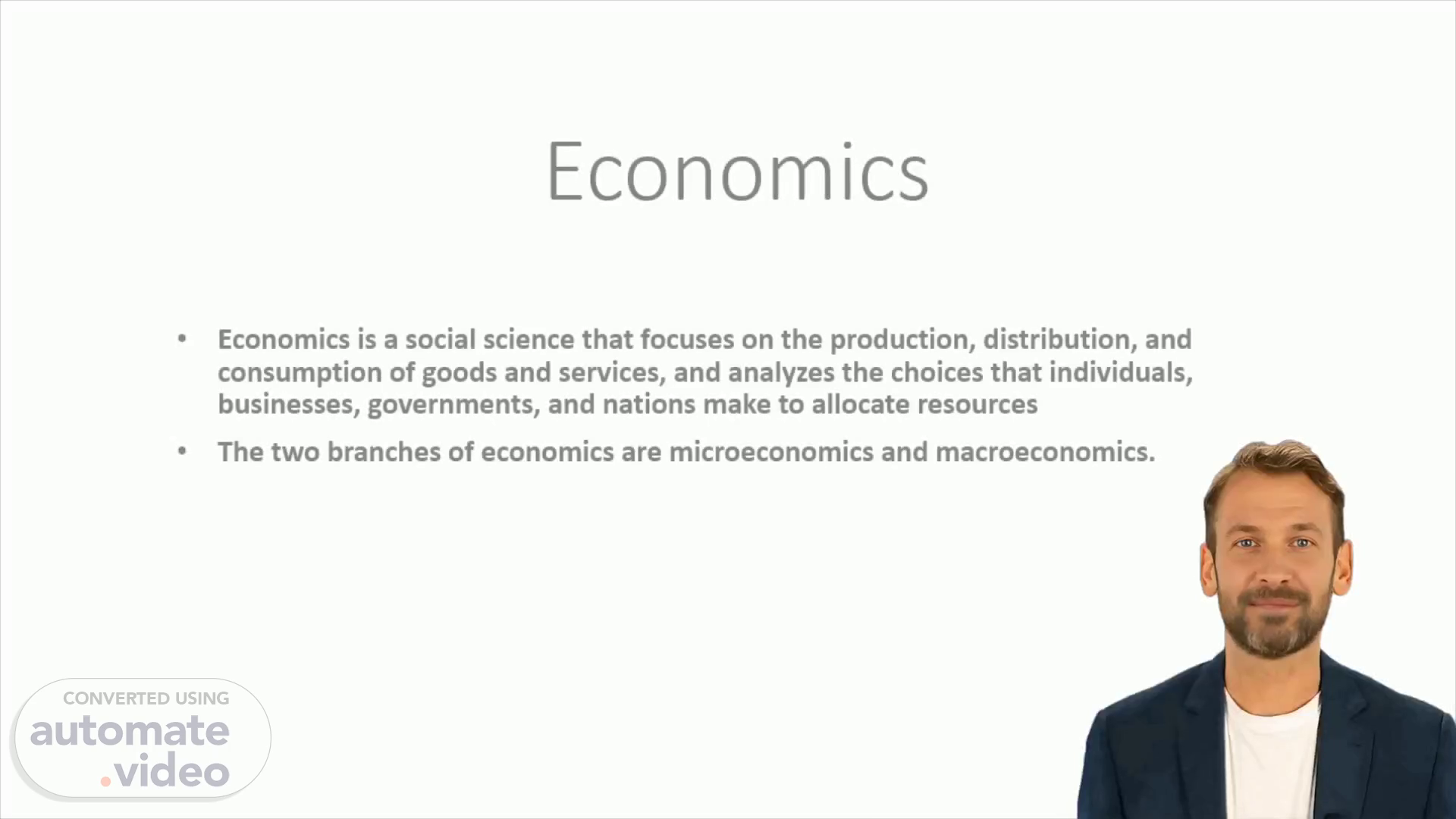 [Virtual Presenter] Economics is a social science that concentrates on the manufacture, allocation, and use of products and enterprises. Microeconomics and macroeconomics are its two primary branches. Economics also assesses effectiveness in production and exchange, which is determined by Gross Domestic Product (GDP) and the Consumer Price Index (CPI). These are a portion of the vital instruments we utilize to decipher the market and make choices that influence our lives..