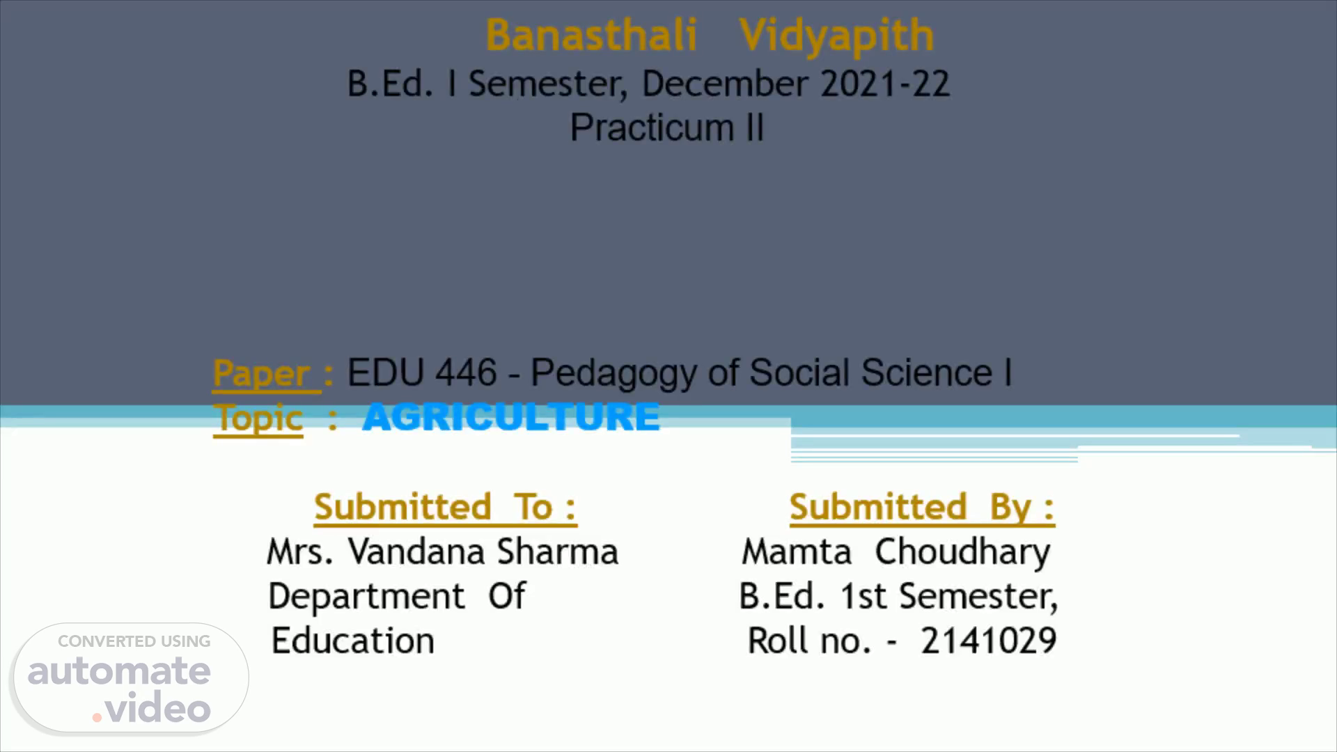 Banasthali Vidyapith B.Ed. I Semester, December 2021-22 Practicum II Paper : EDU 446 - Pedagogy of Social Science I Topic : AGRICULTURE Submitted To : Submitted By : Mrs. Vandana Sharma Mamta Choudhary Department Of B.Ed. 1st Semester, Education Roll no. - 2141029.