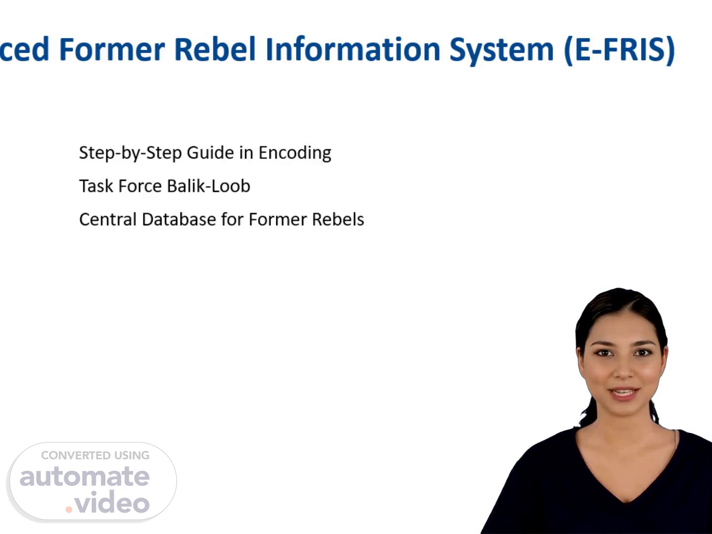 [Virtual Presenter] The encoding process begins with the address of the former rebel. This address is crucial as it provides context for the entire database. The address should include the location where the individual was captured, the date of capture, and any other relevant details. The format for the address is as follows: "Location - Date of Capture - Additional Information". For example, "Kabul - 2001-12-15 - Taliban leader". The address should be concise yet informative, providing enough detail to help researchers understand the context of the former rebel's actions. The next step is to upload the personal data of the former rebel. This can be done through various means such as online forms, paper documents, or even digital files. The uploaded data should be organized and easily accessible, allowing researchers to quickly locate specific information. The data should also be verified for accuracy and completeness. After uploading the personal data, the next step is to add remarks or additional information about the former rebel. These remarks can provide valuable insights into the individual's background, motivations, and actions. They can also serve as a warning or cautionary tale for future researchers. Remarks can take many forms, including written statements, audio recordings, or even video footage. The final step is to assist researchers in accessing and utilizing the encoded data. This may involve providing training on how to use the E-FRIS system, offering guidance on how to navigate the database, or even simply answering questions about the data. Assistance can come in many forms, and it is essential to ensure that researchers have the necessary tools and resources to effectively utilize the data..