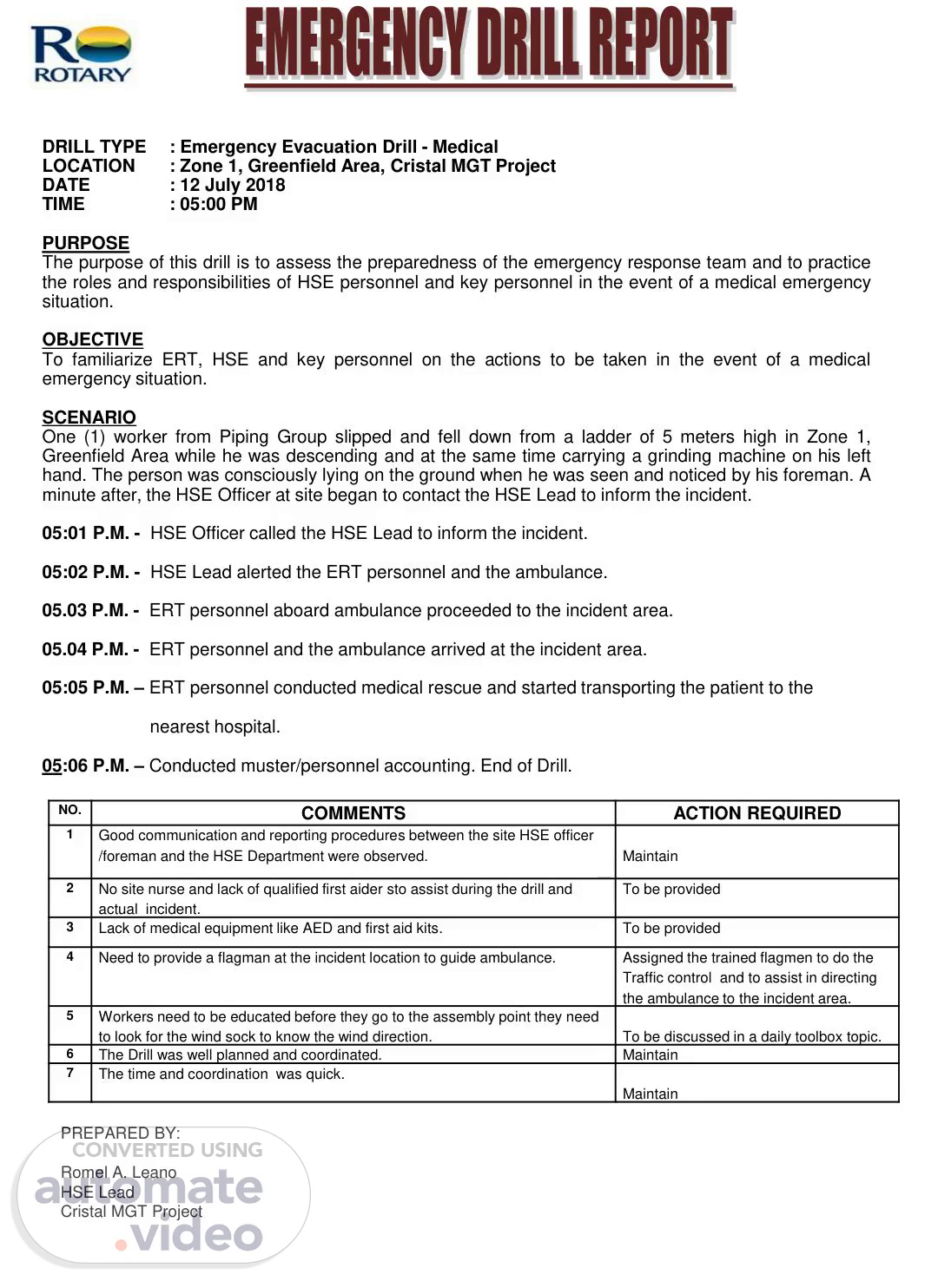 [Audio] DRILL TYPE : Emergency Evacuation Drill - Medical LOCATION : Zone 1, Greenfield Area, Cristal MGT Project DATE : 12 July 2018 TIME : 05:00 PM PURPOSE The purpose of this drill is to assess the preparedness of the emergency response team and to practice the roles and responsibilities of HSE personnel and key personnel in the event of a medical emergency situation. OBJECTIVE To familiarize ERT, HSE and key personnel on the actions to be taken in the event of a medical emergency situation. SCENARIO One (1) worker from Piping Group slipped and fell down from a ladder of 5 meters high in Zone 1, Greenfield Area while he was descending and at the same time carrying a grinding machine on his left hand. The person was consciously lying on the ground when he was seen and noticed by his foreman. A minute after, the HSE Officer at site began to contact the HSE Lead to inform the incident. 05:01 P.M. - HSE Officer called the HSE Lead to inform the incident. 05:02 P.M. - HSE Lead alerted the ERT personnel and the ambulance. 05.03 P.M. - ERT personnel aboard ambulance proceeded to the incident area. 05.04 P.M. - ERT personnel and the ambulance arrived at the incident area. 05:05 P.M. – ERT personnel conducted medical rescue and started transporting the patient to the nearest hospital. 05:06 P.M. – Conducted muster/personnel accounting. End of Drill. PREPARED BY: Romel A. Leano HSE Lead Cristal MGT Project NO. COMMENTS ACTION REQUIRED 1 Good communication and reporting procedures between the site HSE officer /foreman and the HSE Department were observed. Maintain 2 No site nurse and lack of qualified first aider sto assist during the drill and actual incident. To be provided 3 Lack of medical equipment like AED and first aid kits. To be provided 4 Need to provide a flagman at the incident location to guide ambulance. Assigned the trained flagmen to do the Traffic control and to assist in directing the ambulance to the incident area. 5 Workers need to be educated before they go to the assembly point they need to look for the wind sock to know the wind direction. To be discussed in a daily toolbox topic. 6 The Drill was well planned and coordinated. Maintain 7 The time and coordination was quick. Maintain.