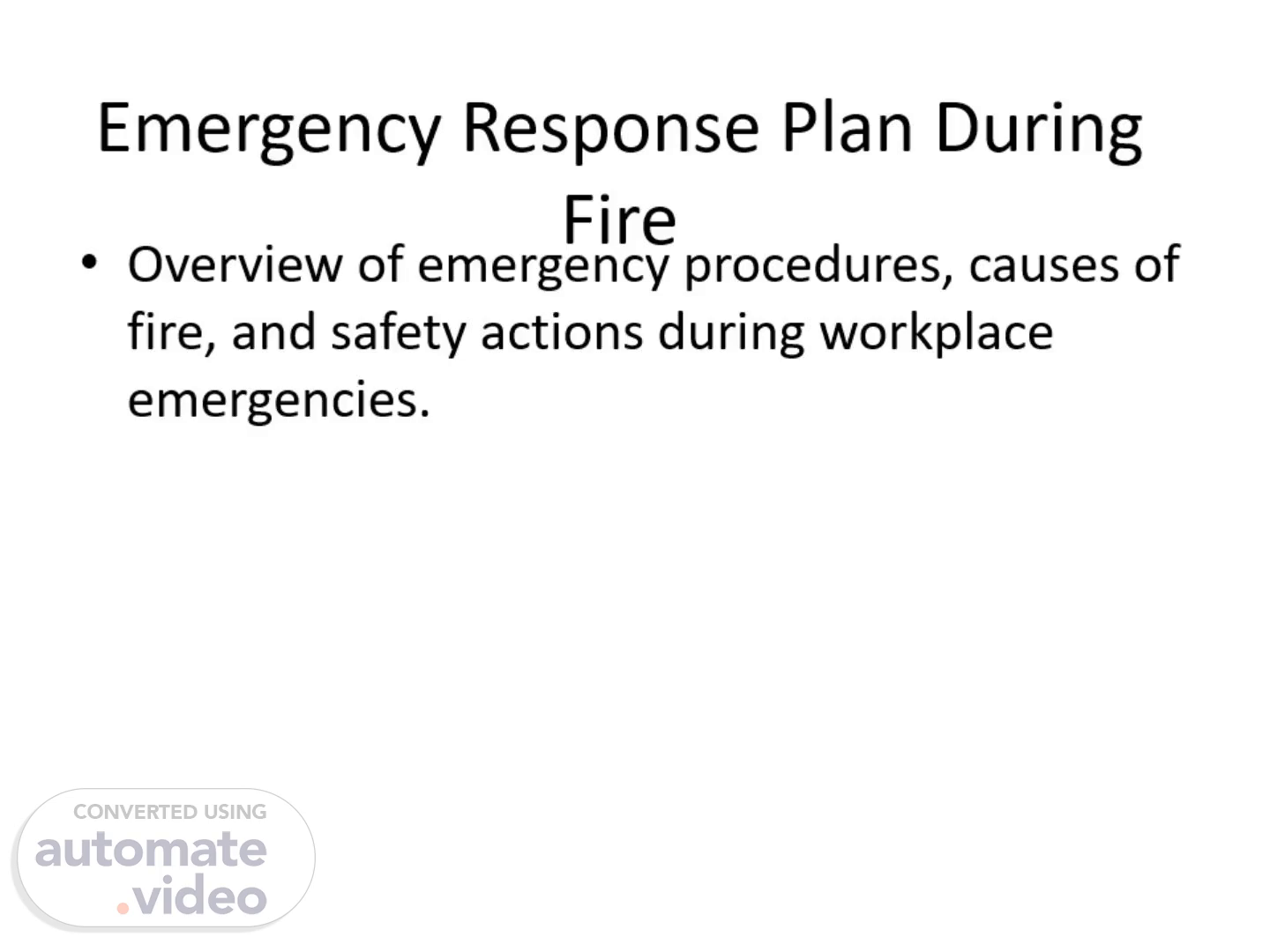 [Audio] Introduce the topic of emergency response during a fire. Explain that the goal of this presentation is to ensure everyone understands the possible causes of fire, how emergencies are reported, and what actions to take to stay safe during an incident..
