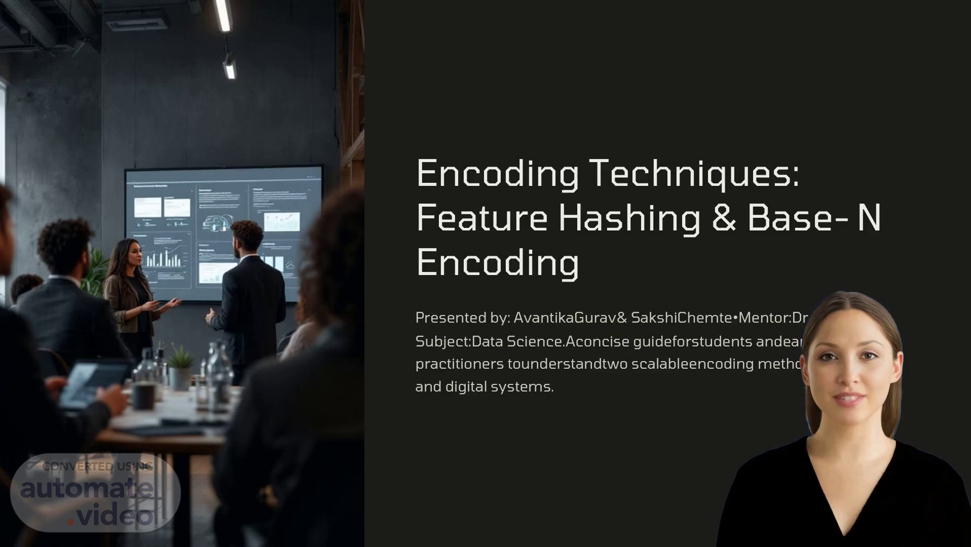 [Audio] Base-N encoding uses numeric systems with N distinct digits such as binary, hexadecimal, or any other base. In digital systems, it is used to compactly represent numbers, bytes, and identifiers for storage, display, and transmission. This method ensures data integrity during transmission or storage by converting data from one representation to another. Feature hashing is a dimensionality reduction technique that maps high-cardinality categorical features into a fixed-size vector. This technique is ideal for representing very large vocabularies and streaming data in a compact and unambiguous manner. Both methods are fundamental techniques in data science for transforming data into suitable formats..