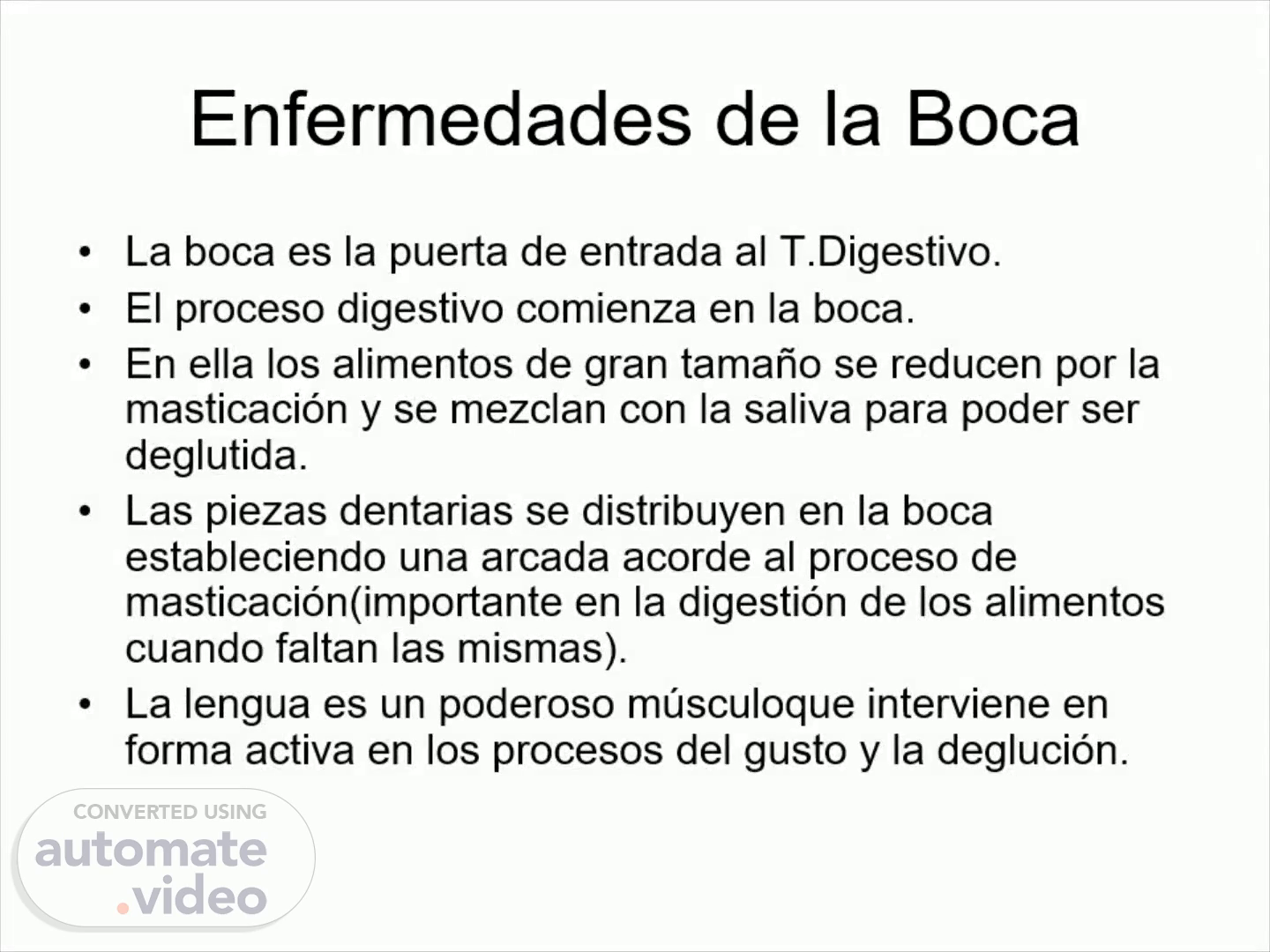 Enfermedades de la Boca. La boca es la puerta de entrada al T.Digestivo. El proceso digestivo comienza en la boca. En ella los alimentos de gran tamaño se reducen por la masticación y se mezclan con la saliva para poder ser deglutida. Las piezas dentarias se distribuyen en la boca estableciendo una arcada acorde al proceso de masticación(importante en la digestión de los alimentos cuando faltan las mismas). La lengua es un poderoso músculoque interviene en forma activa en los procesos del gusto y la deglución..