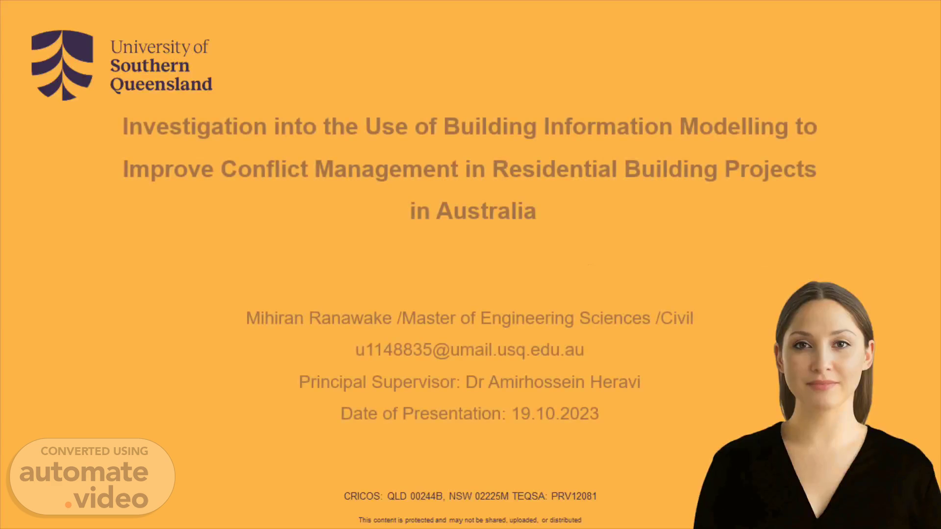 [Virtual Presenter] This research project investigates how Building Information Modelling (BIM) can be utilized to boost conflict management in residential building projects in Australia. Through taking advantage of BIM's capabilities, it is expected that the settlement of conflicts between involved parties can be improved and the duration of projects shortened, leading to both time and money saved. I am pleased to be presenting the findings of this research to you today..