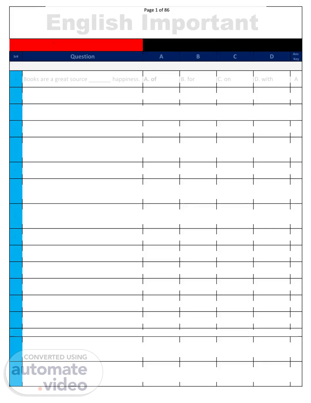 [Audio] This slide provides 86 questions and answers about English important prepositions from TestPoint.pk. Each question is accompanied by four options - A, B, C, and D - from which the correct answer can be selected. From the synonyms of “impeach” to the synonyms of “brutal”, this slide is a valuable resource for English language learners..