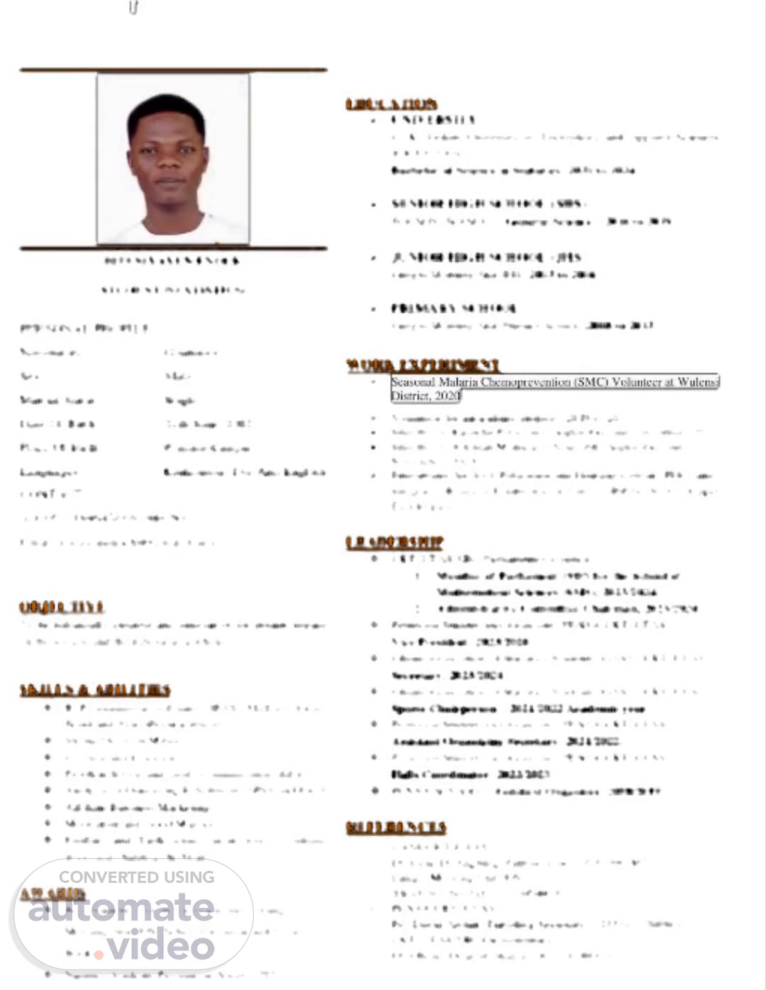 EDUCATION BACKGROUND UNIVERSITY C. K. Tedam University of Technology and Applied Sciences (CKT-UTAS) Bachelor of Science in Statistics -2021 to 2024 SENIOR HIGH SCHOOL (SHS) WA SHS (WASEC) – General Science – 2016 to 2019 JUNIOR HIGH SCHOOL (JHS) Lungni Morning Star JHS -2013 to 2016 PRIMARY SCHOOL Lungni Morning Star Primary School -2008 to 2013 WORK EXPERIMENT Seasonal Malaria Chemoprevention (SMC) Volunteer at Wulensi District, 2020 Volunteer for agriculture projects, 2019 to 2021 Intership at Kpandai Polyclinic, September and November, 2022 Intership at Adentan Municipal Assembly, September and November, 2024 Enumerator for 2021 Polulation and Housing Census (PHC) and Integrated Business Establishment Survey (IBES), 2024 at Upper East Region LEADERSHIP CKT-UTAS SRC Parliamentry Council 1. Member of Parliament (MP) for the School of Mathematical Sciences (SMS), 2023/2024. 2. Administrative Committee Chairman, 2023/2024 Pentecost Student and Associate (PENSA CKT-UTAS) Vice President, 2023/2024 Ghana Association of Statistics Students (GASS –CKT-UTAS). Secretary, 2023/2024 Ghana Association of Statistics Students (GASS –CKT-UTAS). Sports Chairperson – 2021/2022 Academic year. Pentecost Student and Associate (PENSA CKT-UTAS) Assistant Organizing Secretary -2021/2022. Pentecost Student and Associate (PENSA CKT-UTAS) Halls Coordinator -2022/2023 PENSA WA SHS – Assistant Organizer, 2018/2019 REFERENCES GASS CKT-UTAS Dr. Irene D. Angbing, Patroness (+233545566746) Lungni Morning Star JHS (Head Teacher Tel. +233345447975) PENSA CKT-UTAS Pst. David Arthur, Traveling Secretary (+233544778696) CKT-UTAS SRC Parliamentary Dr. Ohene, Dean of Students (0244110017) BITI NIYAYUN ENOCK STUDENT (STATISTICS) PERSONAL PROFILE Nationality : Ghanaian Sex : Male Marital Status : Single Date Of Birth : 24th June, 2002 Place Of Birth : Wulensi-Lungni Languages : Konkomba, Twi And English CONTACT Tel: 0557189647/0597988291 Email: [email protected] OBJECTIVE To be holistically creative and innovative for greater impact on the society and the nations as a whole. SKILLS & ABILITIES R Programming software, SPSS, MatLab, Excel, Word and PowerPoint softwares Strong Decision Maker Creative and Innovative Problem Solver and good communication skills Analysis of Data using R-Software, SPSS and Excel Affiliate Business Marketing Motivation and Good Manners Football and Table tennis AWARDS Best Student’s Award in Academics – Lungni Morning Star JHS (School Uniforms and Exercise Books) National Students Prestigious Award -2021.