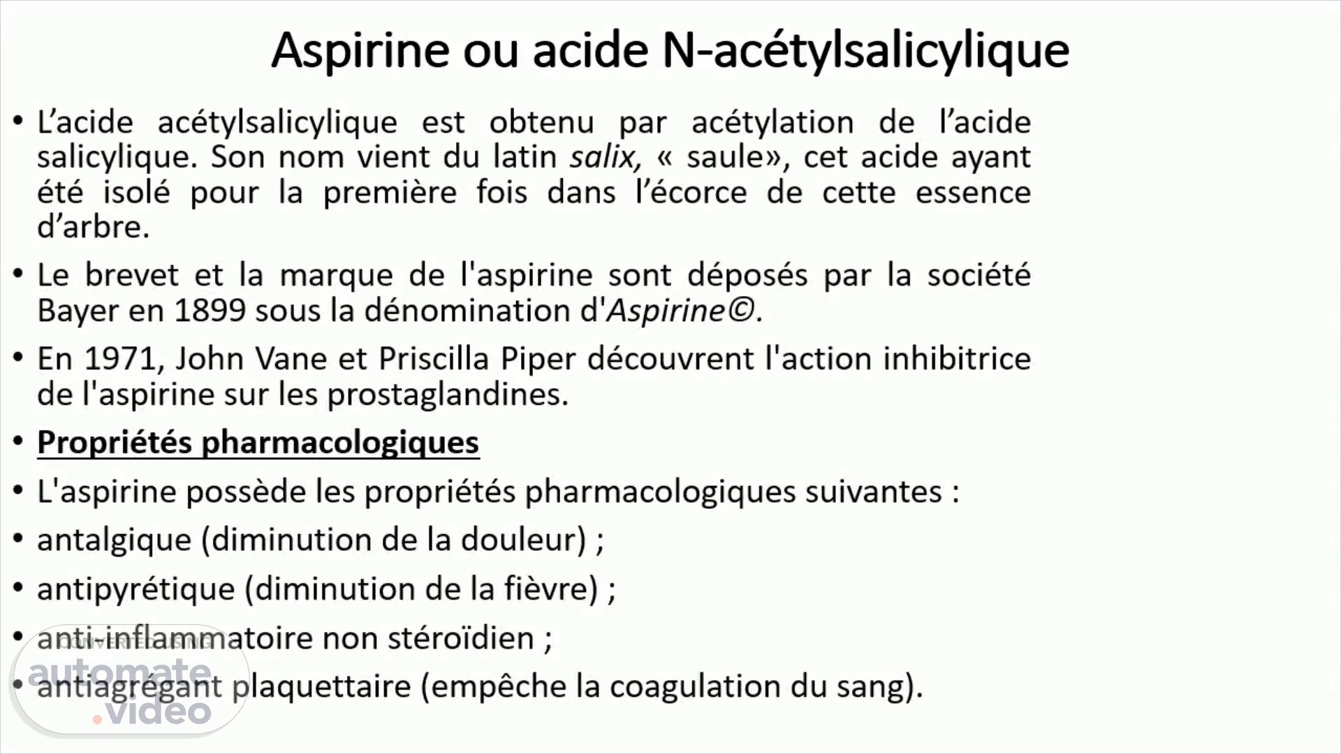 Aspirine ou acide N-acétylsalicylique. L’acide acétylsalicylique est obtenu par acétylation de l’acide salicylique. Son nom vient du latin salix , « saule», cet acide ayant été isolé pour la première fois dans l’écorce de cette essence d’arbre . Le brevet et la marque de l'aspirine sont déposés par la société Bayer en 1899 sous la dénomination d' Aspirine©. En 1971, John Vane et Priscilla Piper découvrent l'action inhibitrice de l'aspirine sur les prostaglandines. Propriétés pharmacologiques L'aspirine possède les propriétés pharmacologiques suivantes : antalgique (diminution de la douleur) ; antipyrétique (diminution de la fièvre) ; anti-inflammatoire non stéroïdien ; antiagrégant plaquettaire (empêche la coagulation du sang)..